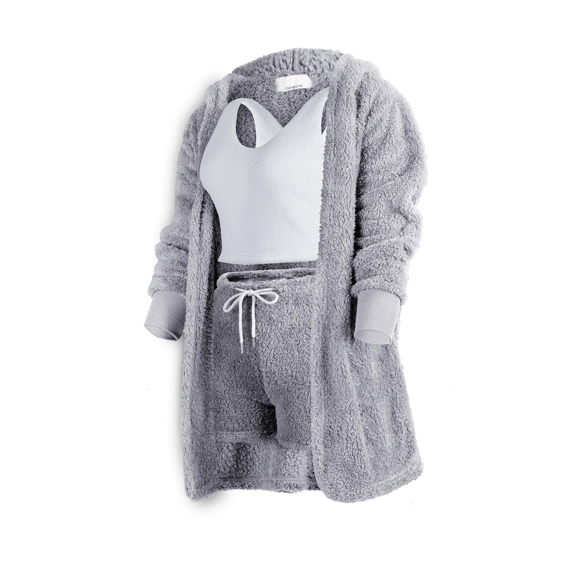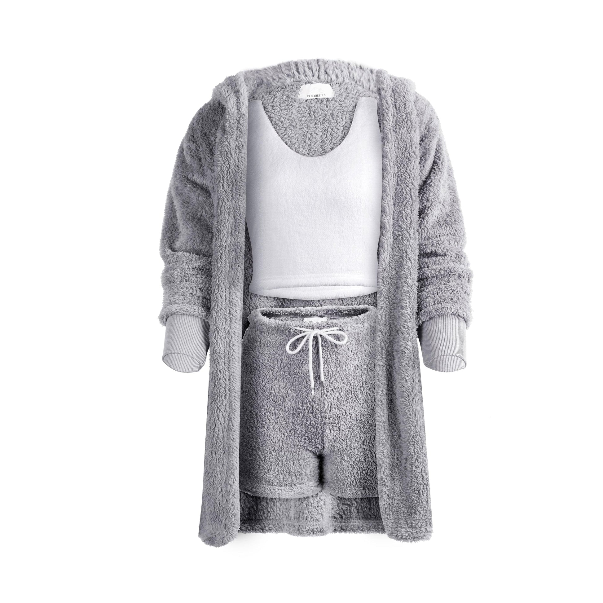 - Minkšta ir švelni vilnos audinio medžiaga puikiai priglus ir palaikys jūsų kūno šilumą. Išskirtinis trijų dalių komplektas - šortukai, marškinėliai be rankovių ir chalatas leis pajausti ypatingą lengvumo pojūtį nešiojant.