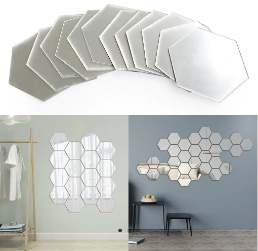 Šešiakampiai veidrodiniai lipdukai pagaminti iš atspindinčios akrilo medžiagos, todėl akimirksniu atnaujina interjero estetiką per daug neišlaidaujant.