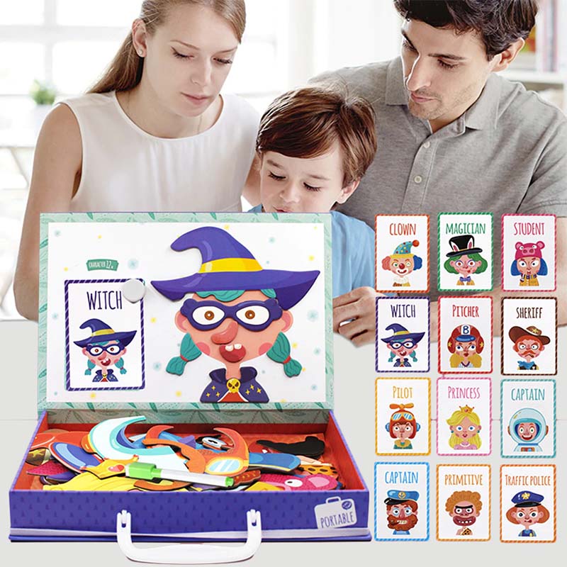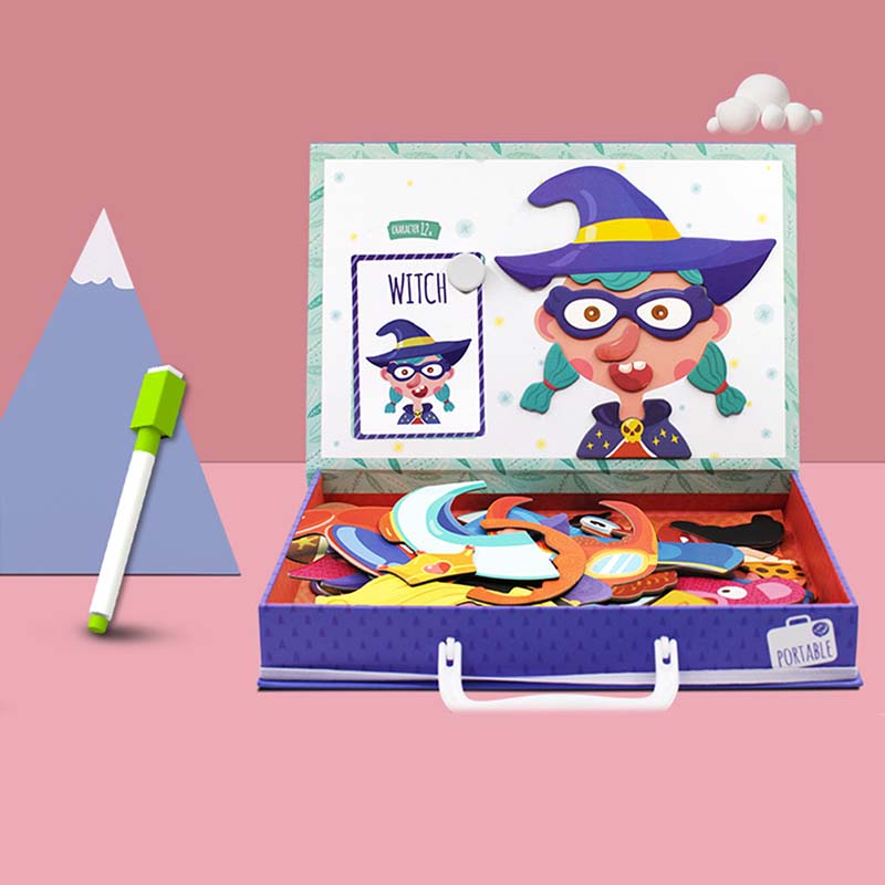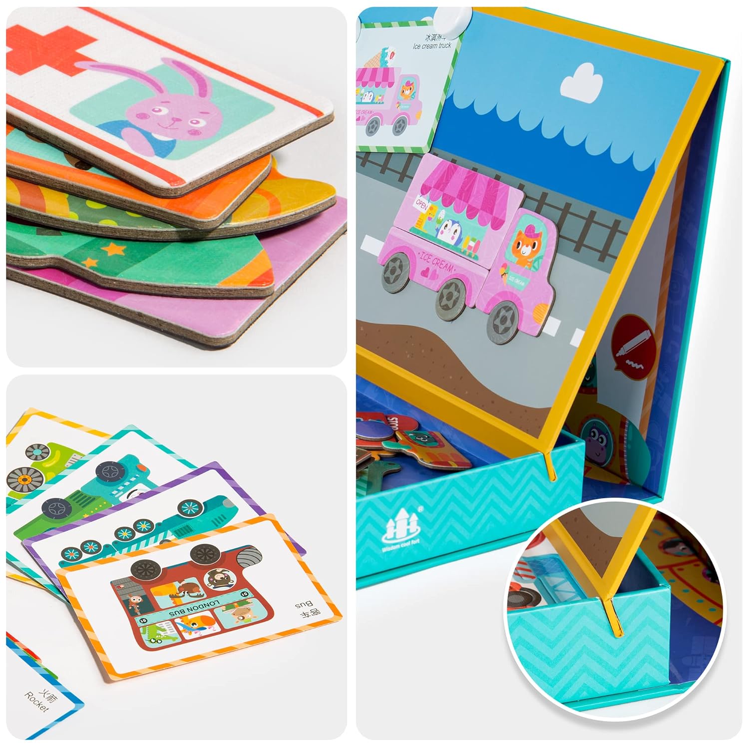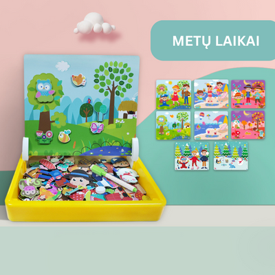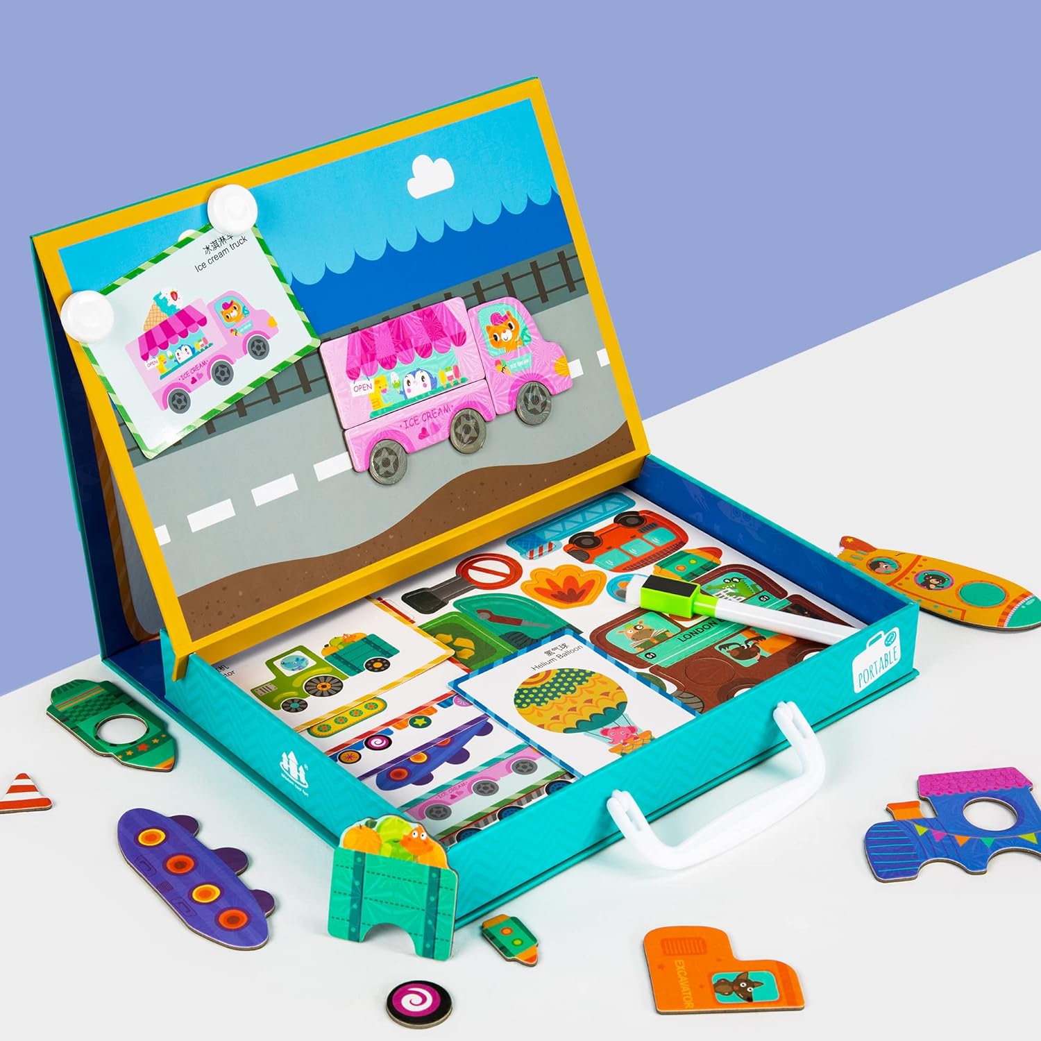 Su 12 spalvingomis kortelėmis ir magnetine lenta, vaikai gali kurti įvairias scenas, skatinančias jų vaizduotę ir kūrybiškumą.