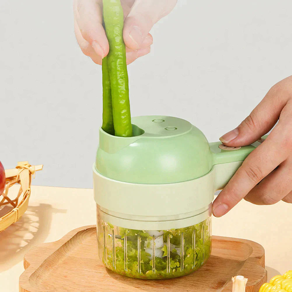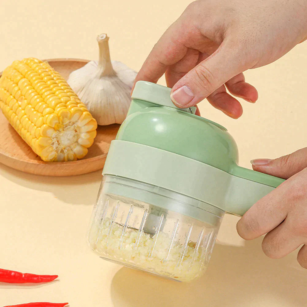 Į pakuotę įeina: 4 viename rankinių elektrinių daržovių pjaustytuvų rinkinys