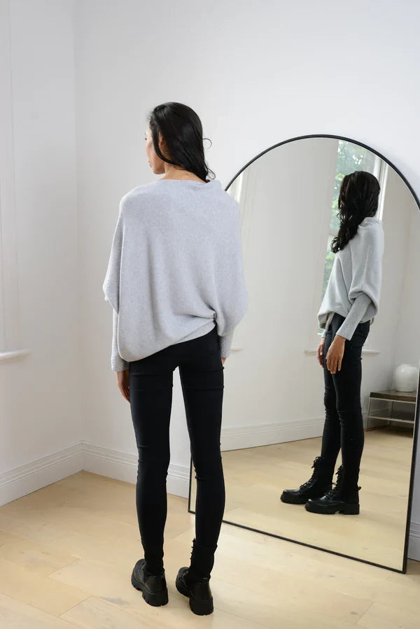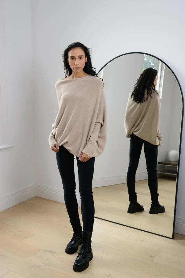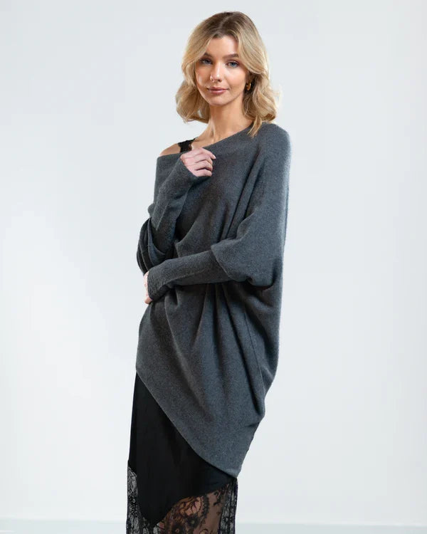 - Išskirtinio dizaino megztinis yra švelnus ir minkštas. Asimetriškos formos megztinį galima nešioti dviem būdais - galima nuleisti rankovės žemiau pečių arba pakelti jas ir nešioti kaip įprastą megztinį.