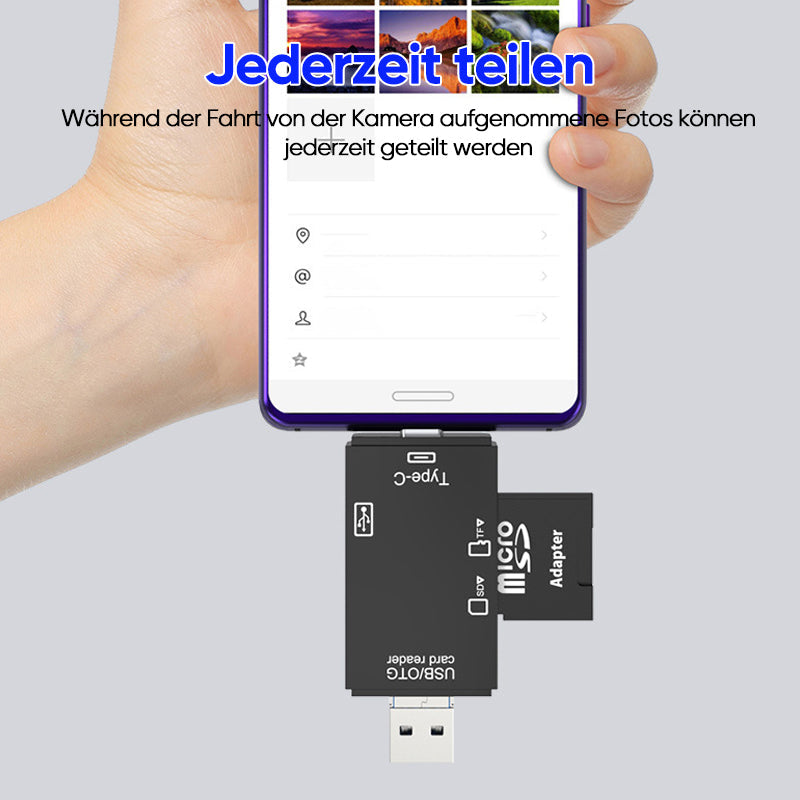 Skaitytuvas yra pritaikytas įvairioms sąsajoms - USB, USB C, mikro USB, įkrovimo prievadui "Apple" įrenginiams, SD kortelės, mikro SD kortelės lizdui.