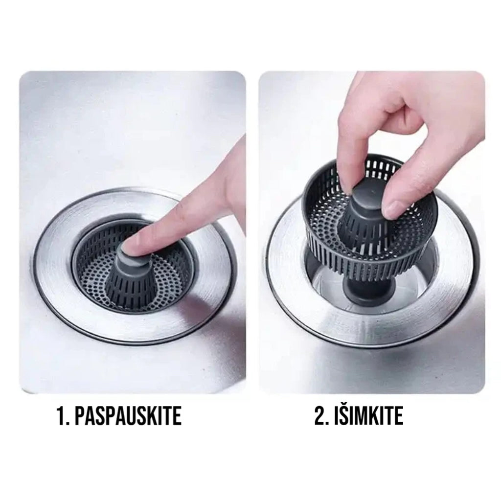 Jį lengva naudoti. tiesiog lengvai paspauskite atšokusią šerdį. kad ji virstų kriauklės kamščiu vandeniui laikyti. Paspauskite dar kartą. kad vanduo pratekėtų. o virtuvės atliekos liktų filtre.
