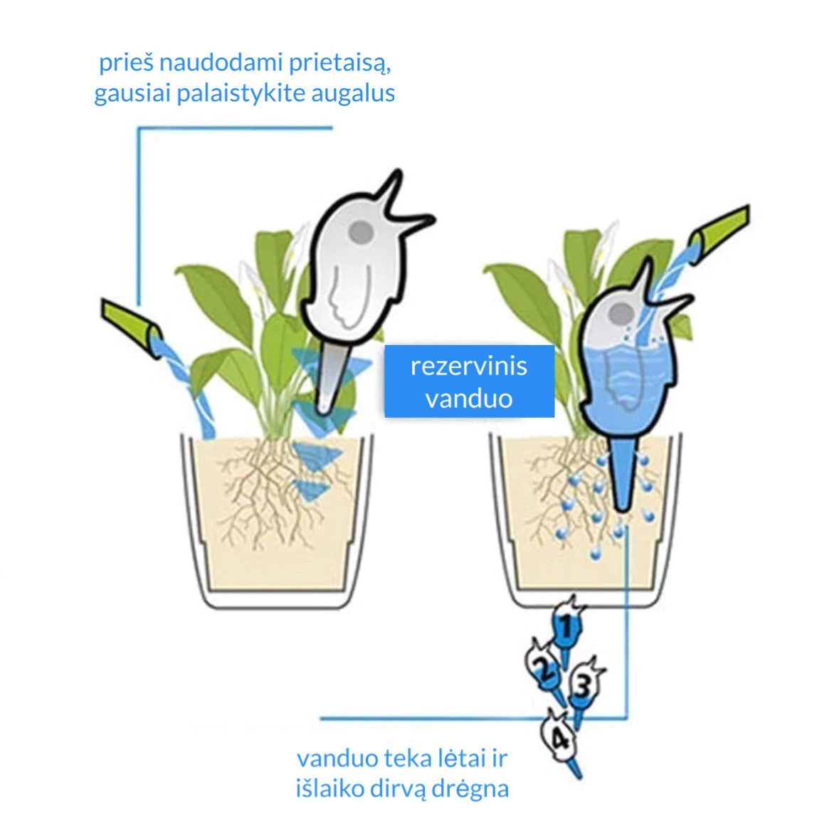- AUTOMATINIS LAISTYMAS: vanduo palaipsniui išsiskiria. kai augalui reikia vandens. Nereikia nerimauti. kad prarasite dirvožemį ar maistingąsias medžiagas.