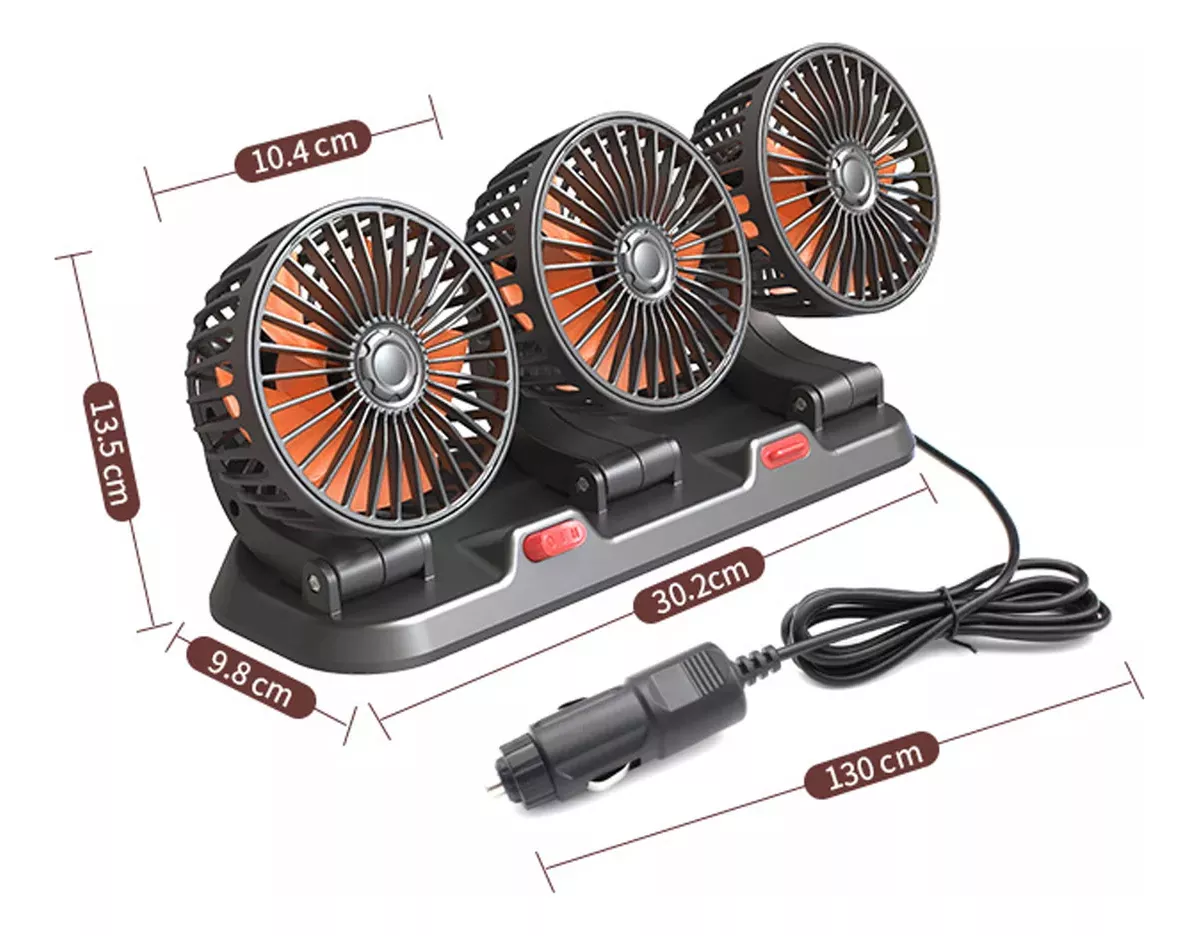- Net trys ventiliatoriaus galvutės, kurios sukasi įvairiomis kryptimis! Tai puikus sprendimas neturint automobilyje oro kondicionavimo sistemos arba jei reikia papildomos ventiliacijos. Ekonomiškas ventiliatorius naudoja 12 V maitinimą ir yra prijungiamas prie maitinimo lizdo. Puikiai tinka ilgų kelionių metu!