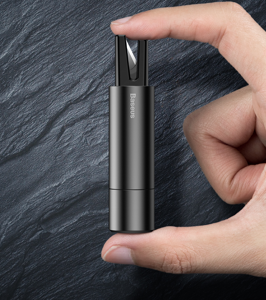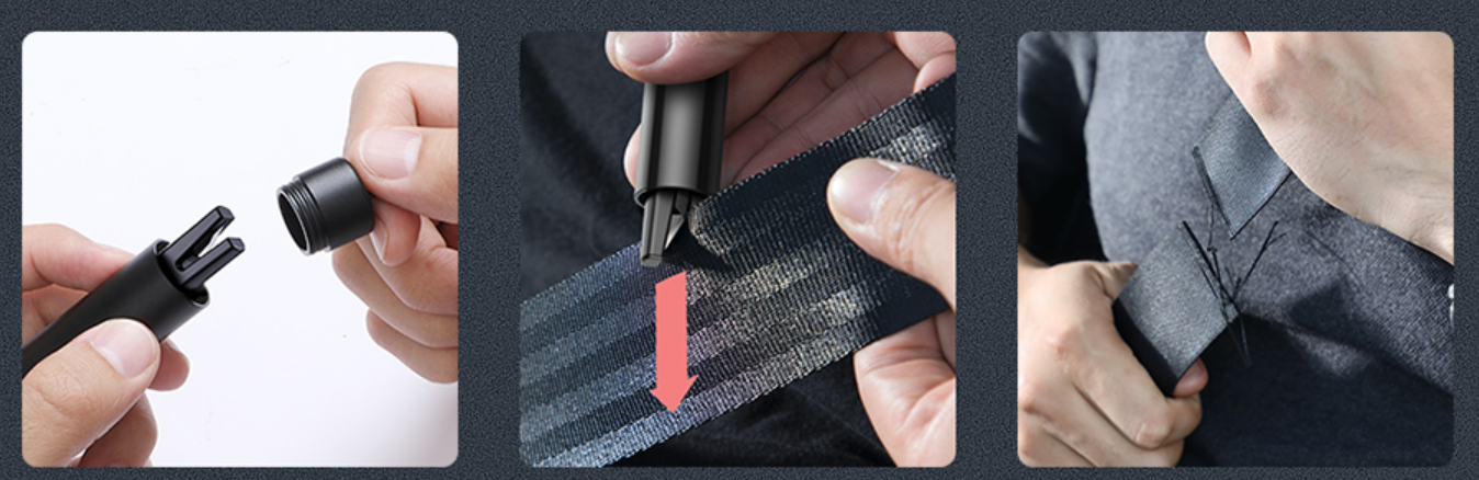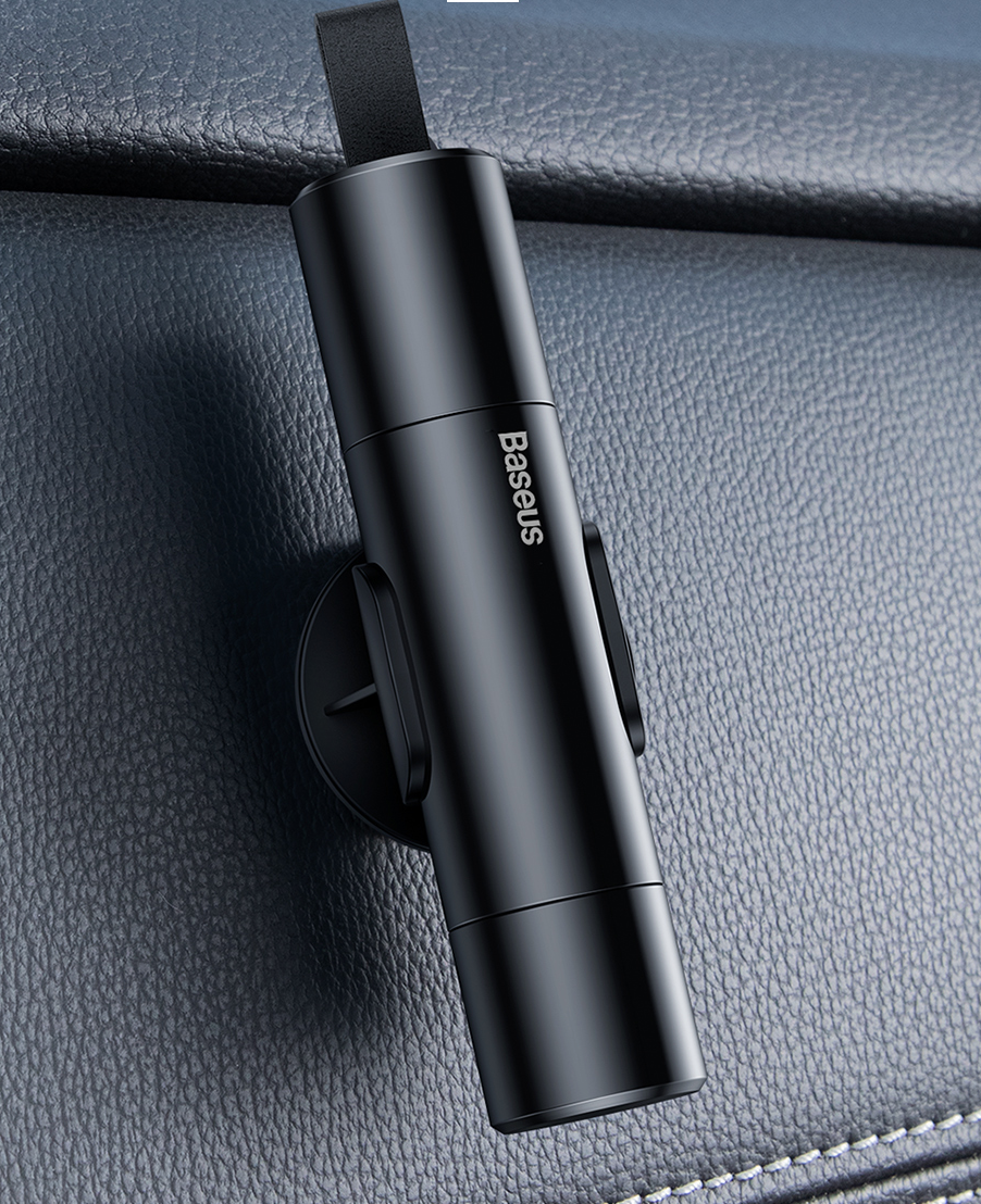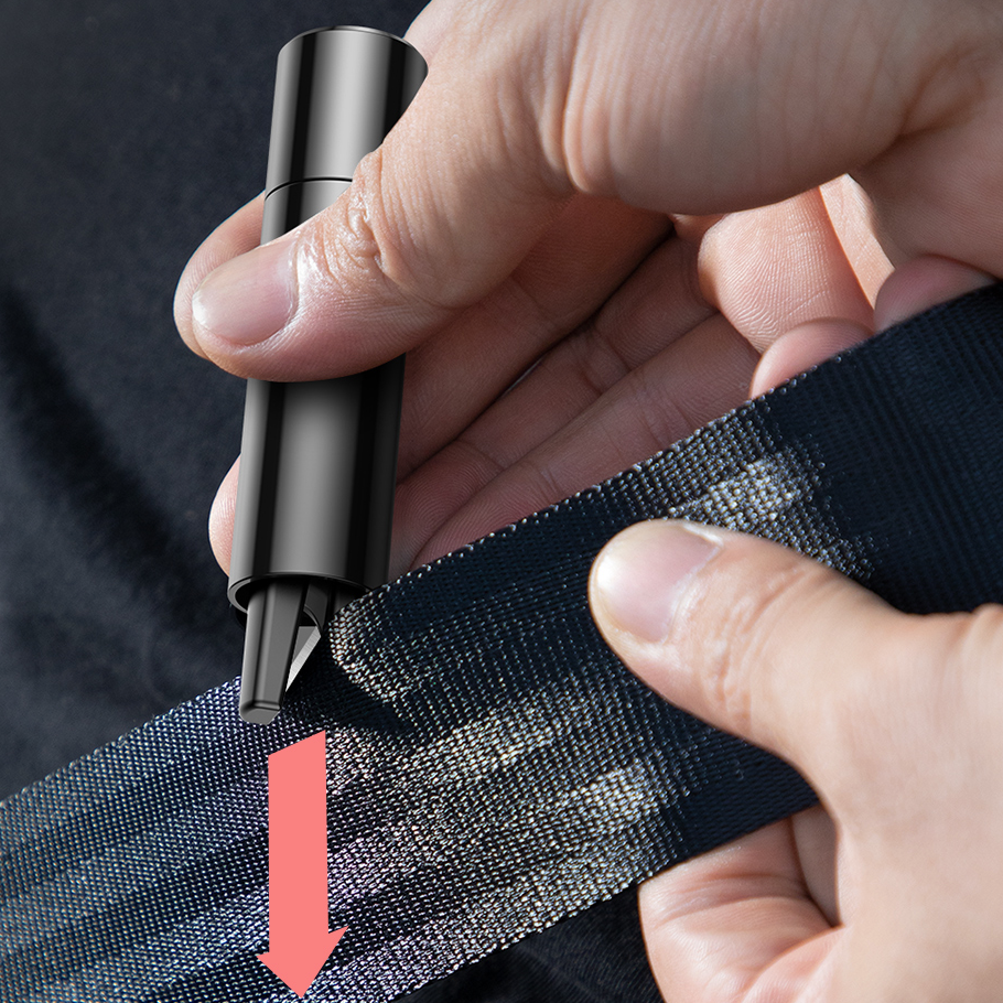 Su įmontuotu peiliu galite ne tik perpjauti saugos diržą, bet ir metalą.