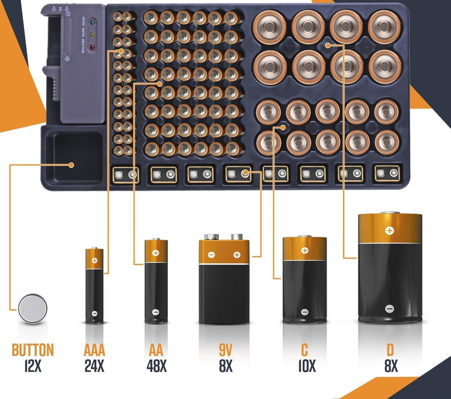 Telpa iki 93 įvairaus dydžio baterijų: 45 AA, 25 AAA, 4 9 voltų, 8 C, 6 D ir 5 plokščios baterijos.
