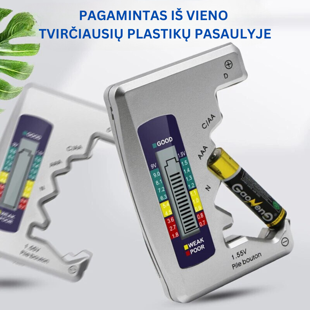 ✔️ Universalumas - tinka daugeliui baterijų tipų, įskaitant C, AA, AAA, D, N, 9V ir 1.55V mygtukinius elementus.