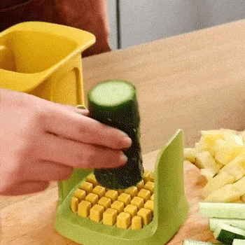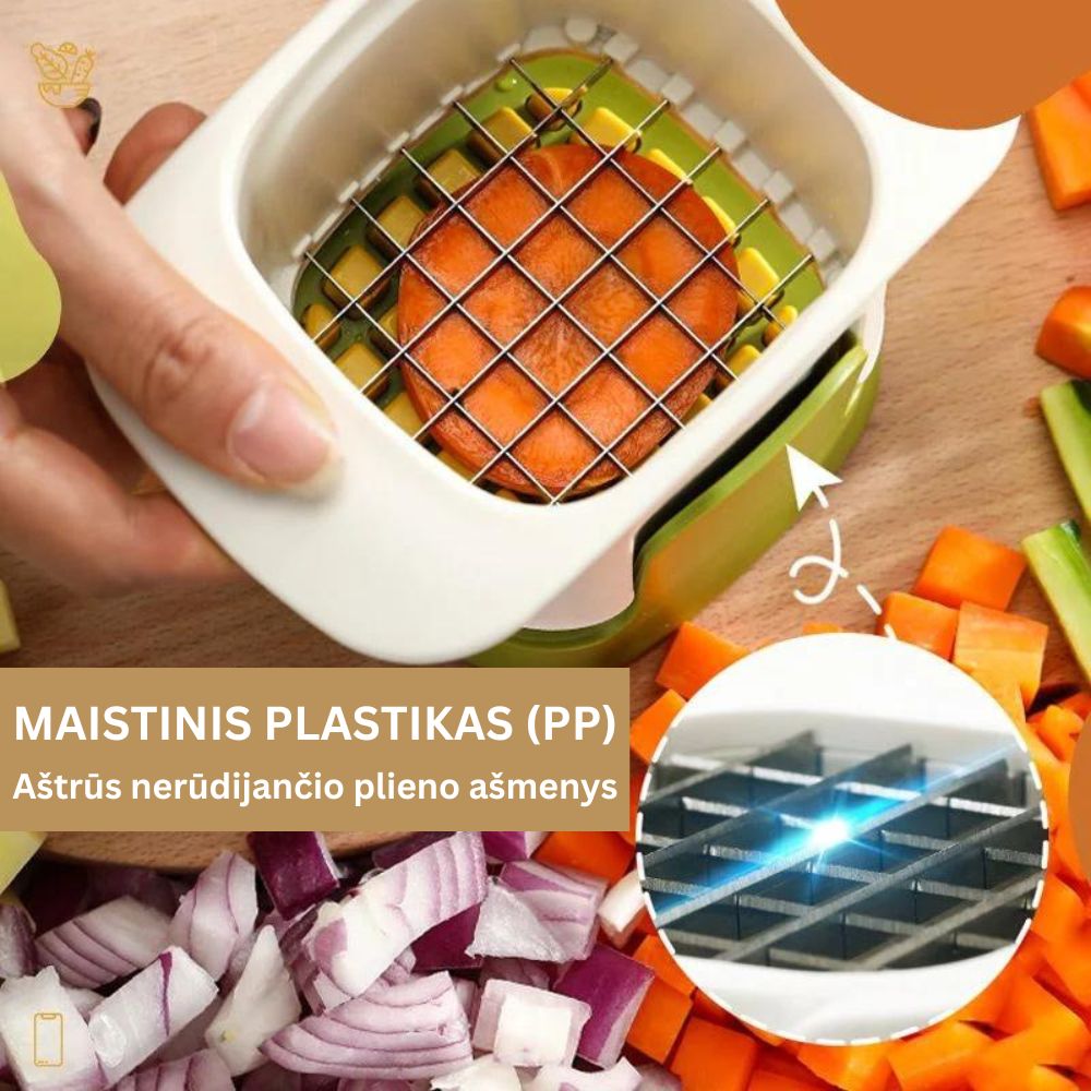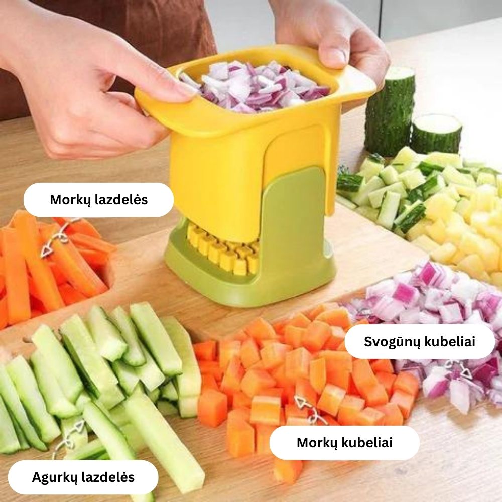 Nereikia dažnai pjaustyti peiliu, tiesiog švelniai paspauskite smulkintuvą ir daržoves greitai supjaustysite kubeliais arba šiaudeliais.