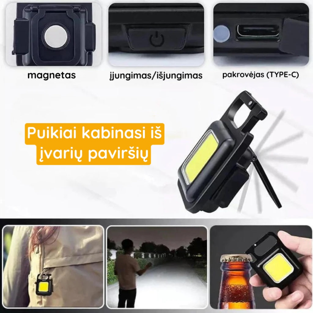 Galingas apšvietimas - šis mini raktų žibintuvėlis turi COB lempos rutuliukus. galinčius skleisti stulbinančią 500 liumenų šviesą. Be to. jis turi C tipo USB įkrovimo jungtį. todėl jį galite įkrauti bet kuriuo maitinimo šaltiniu. turinčiu USB jungtį.