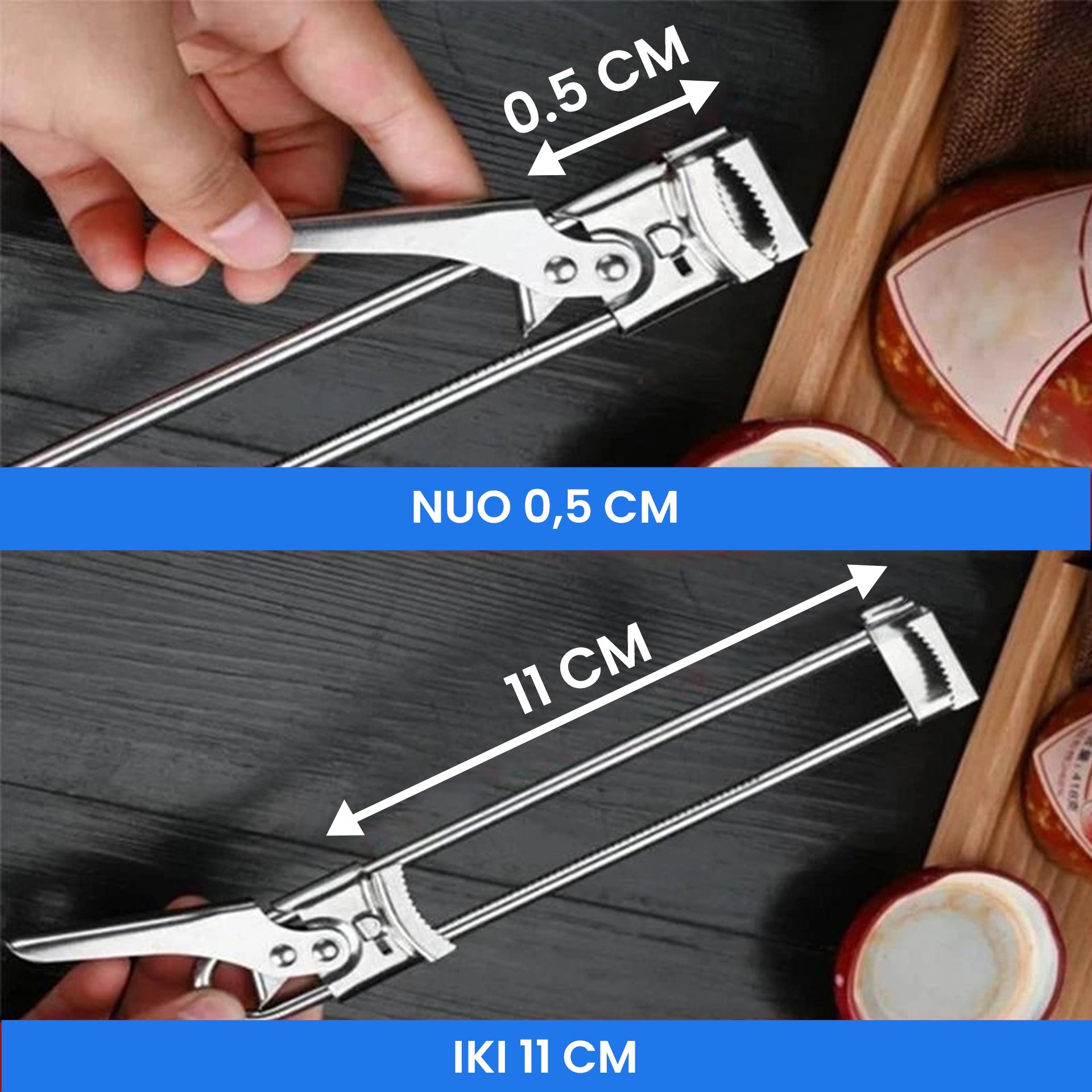 - Reguliuojamas įrankio dizainas: atidarytuvą galima reguliuoti pagal stiklainio dangtelio dydį;