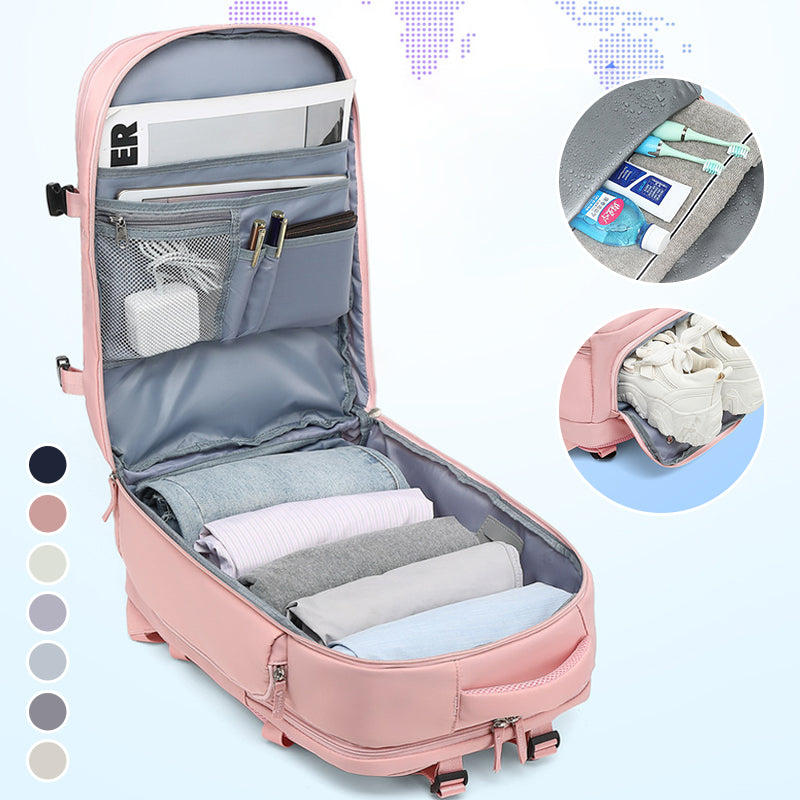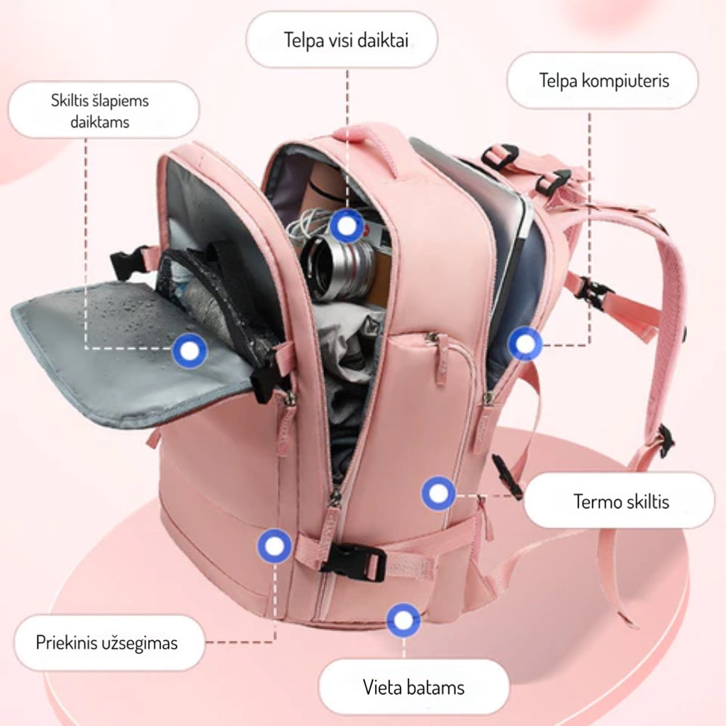 Didelė kelioninė kuprinė moterims: ši kuprinė pagaminta iš patvaraus vandeniui atsparaus poliesterio. gerai praleidžiančio orą ir skleidžiančio šilumą. Ji turi dvi paminkštintas petnešas. kurios užtikrina lengvą nešiojimą ir sustiprina tvirtumą. sumažina spaudimą pečiams ir išlaiko vėsą. kai naudojama ilgą laiką. Be to. ji yra patvari. stabili ir neblunka.