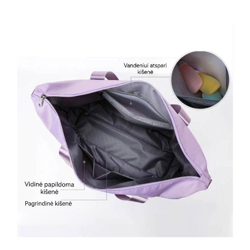 - Didelio tankio vandeniui atspari medžiaga gali padėti atskirti sausus ir šlapius daiktus. Jei turite šlapius drabužius ar rankšluostį. galite drąsiai dėti juos į šį krepšį.