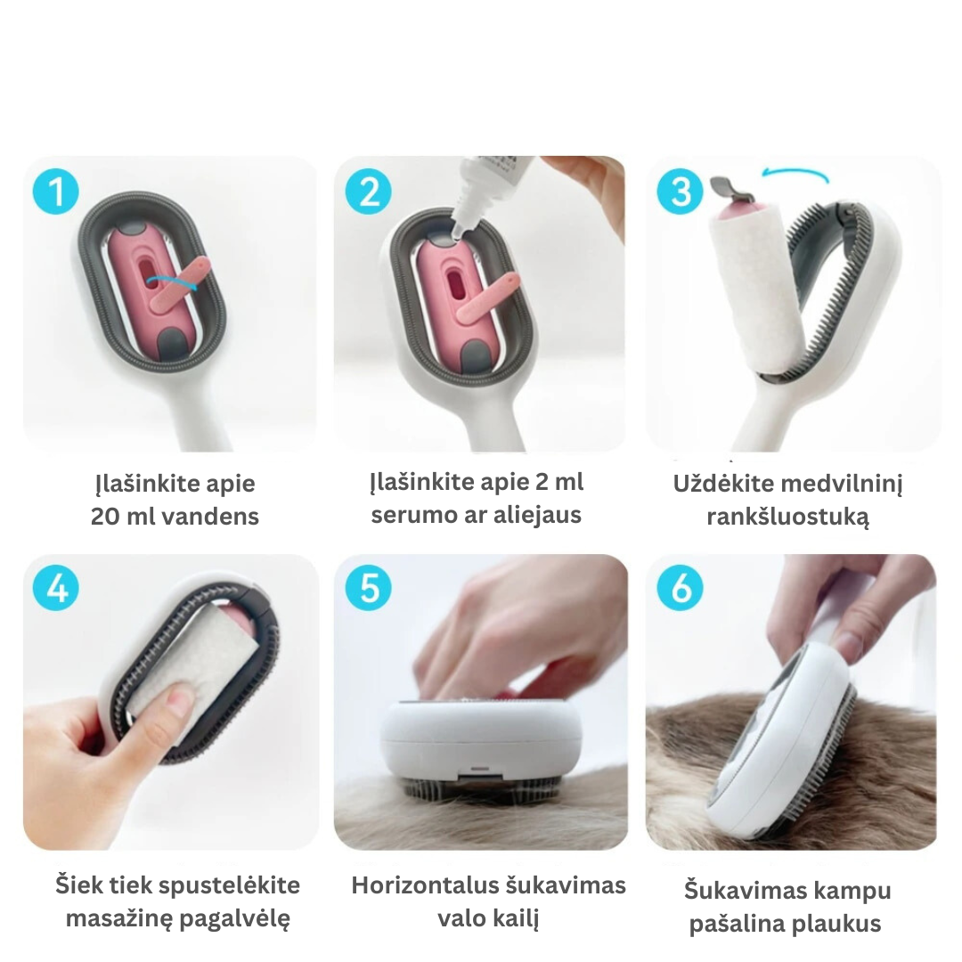 Sukurkite malonią priežiūros patirtį savo augintiniui su mūsų inovatyviomis šukomis. Jų unikalus dizainas ne tik palengvina plaukų šalinimą, bet ir užtikrina švelnų odos drėkinimą. Tai puikus sprendimas švarai namuose palaikyti ir augintinio komfortui užtikrinti.