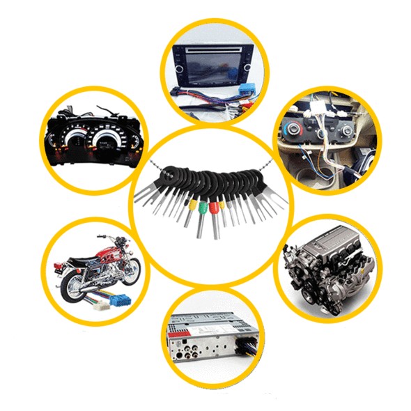 - Rinkinį sudaro 38 vienetai raktų, kurie užtikrina saugų elektrinių jungčių, jungčių blokų atjungimą bei išmontavimą. Įrankių dėka nepažeisite aplinkui laidus esančių komponentų. Rinkinys yra itin naudingas remontuojant automobilius bei įvairią elektroniką.