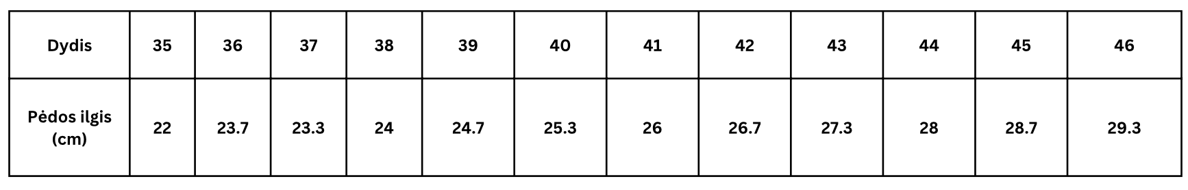 Kad išsirinktumėte geriausiai Jums tinkantį dydį, rekomenduojame vadovautis pateikta dydžių lentele.