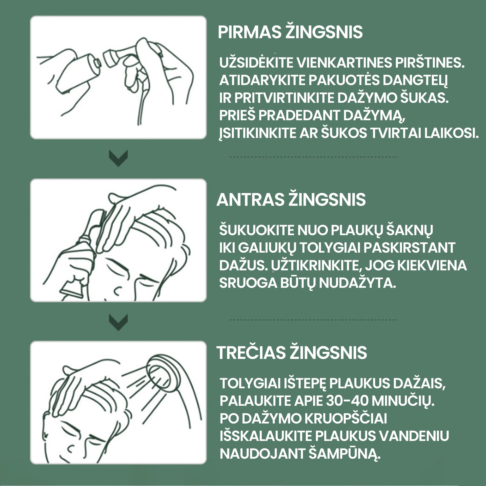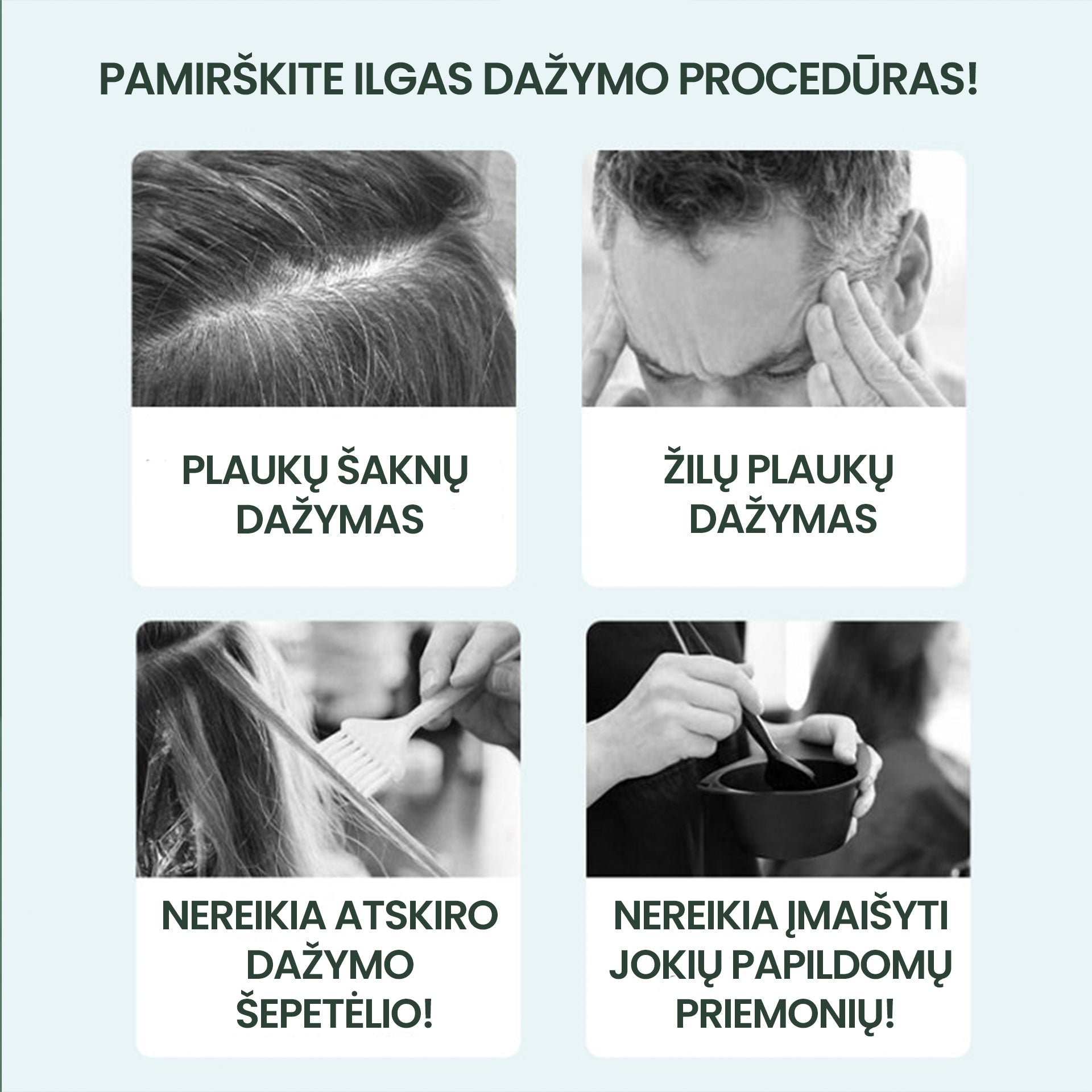 - Venkite dažyti plaukus, jei esate alergiški, turite jautrią ar niežtinčią galvos odą arba kitokių galvos odos pažeidimų.