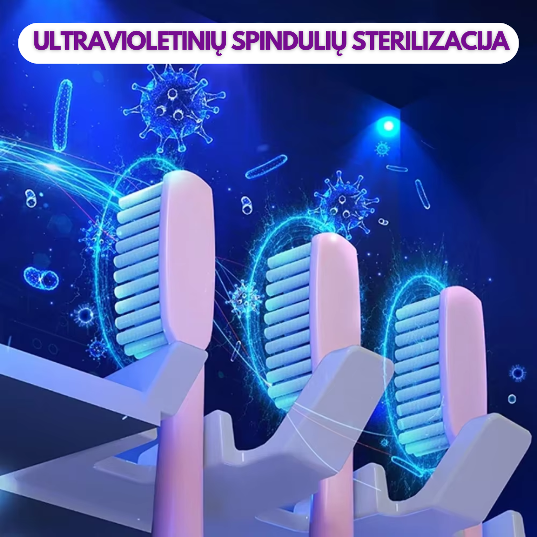 - UV šviesos sterilizacija: sunaikina iki 99% bakterijų, esančių ant dantų šepetėlio, užtikrinant švarą ir saugumą.