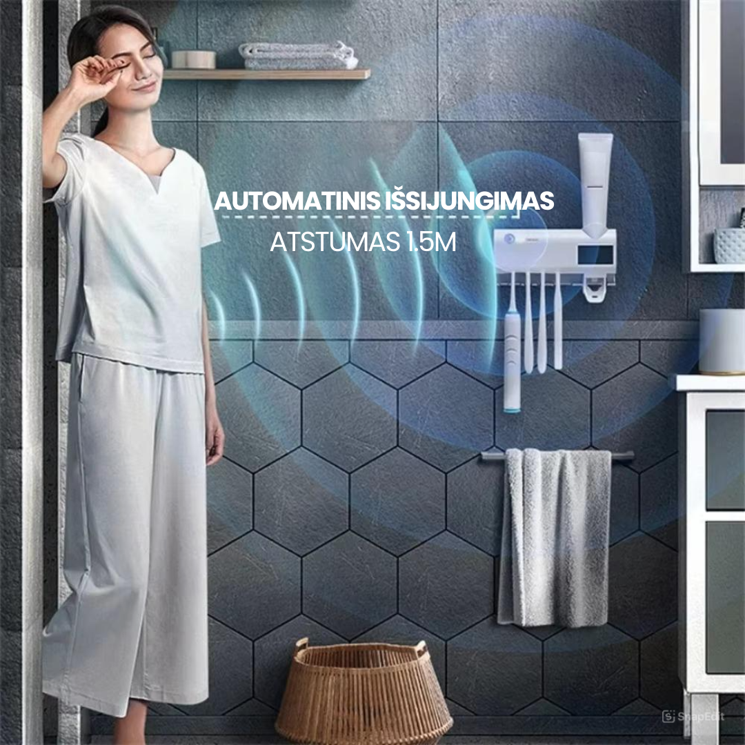 Inovatyvus dantų higienos įrenginys su UV sterilizatoriumi ir dantų pastos dozatoriumi
