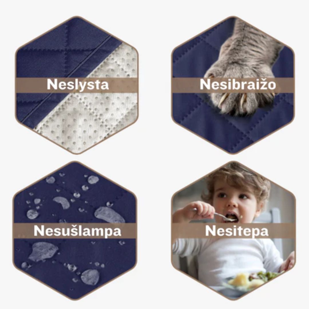 - Užvalkalai kokybiškai apsaugo sofą nuo apgadinimo, tad galėsite nesirūpinti, kad baldą negrįžtamai išteps žaidžiantys vaikai ar augintiniai.