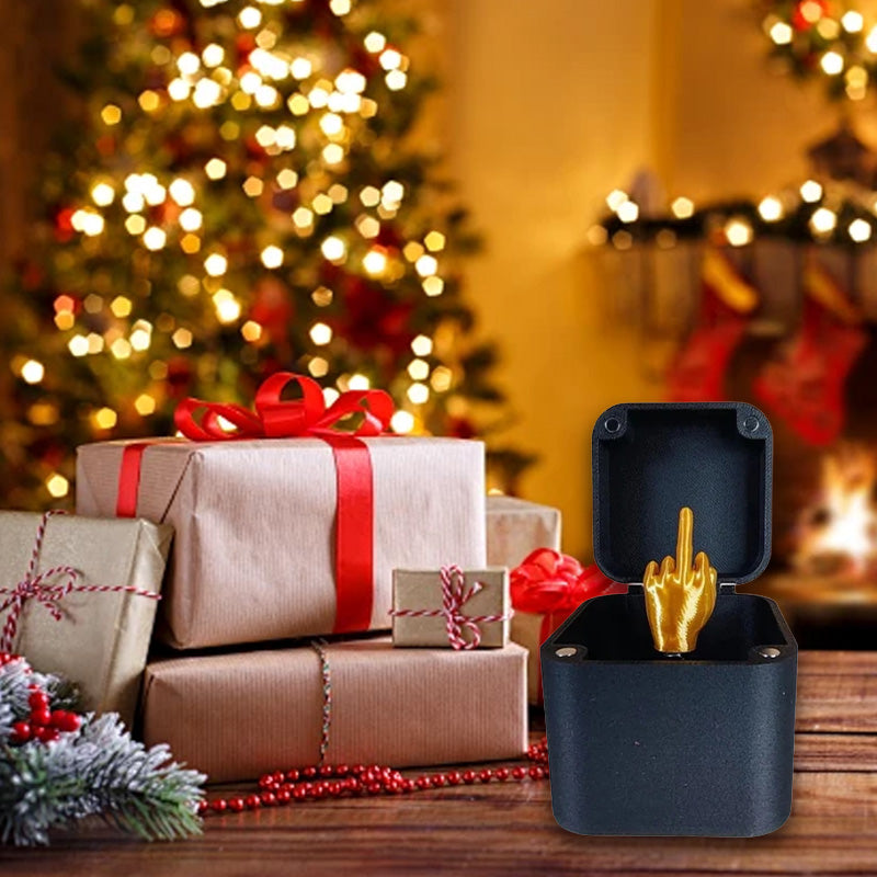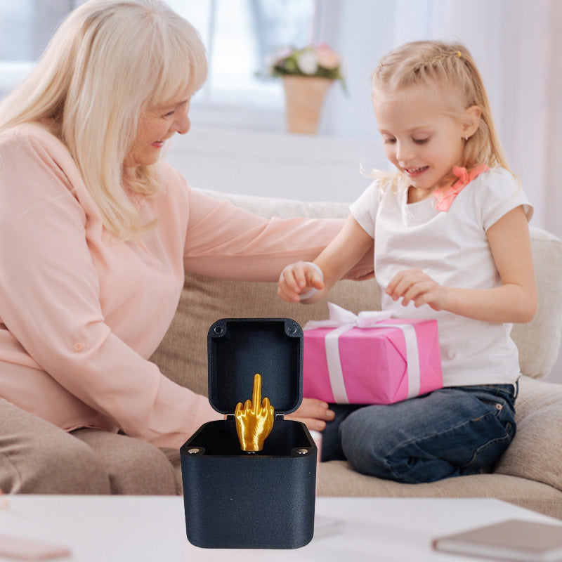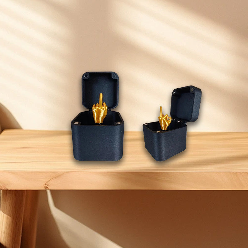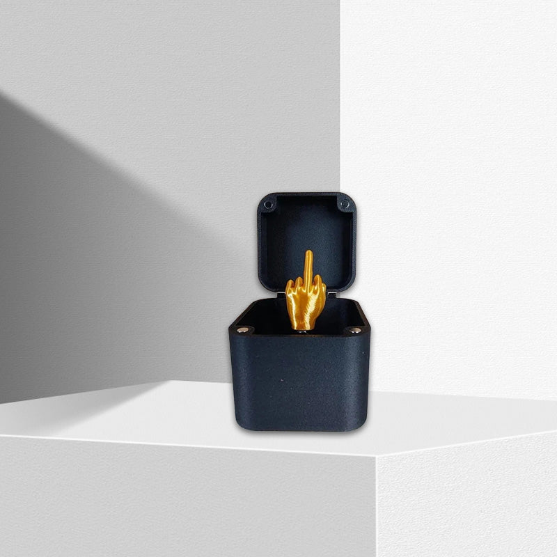 - Unikali dėžutė, kurios viduje slypi auksinis vidurinis pirštas! Dėžutės dydis - 5 cm x 5 cm x 5 cm. Dėžutė pagaminta iš aukštos kokybės PLA plastiko, yra patvari ir ilgaamžė. Blizgantis auksinis užrašas suteikia juvelyrinei dėžutei prabangos!