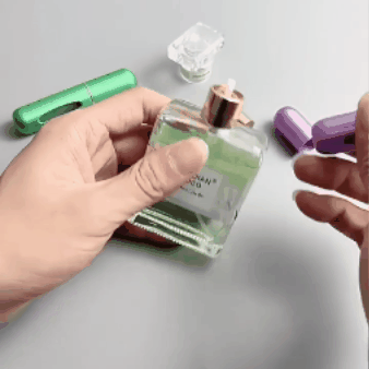 Įpilkite skystį: Nuimkite kvepalų buteliuko galvutę ir uždėkite mūsų buteliuką ant jo viršaus. Pradėkite spaudinėti mūsų kelioninį buteliuką tol, kol šis prisipildys kvepalų.