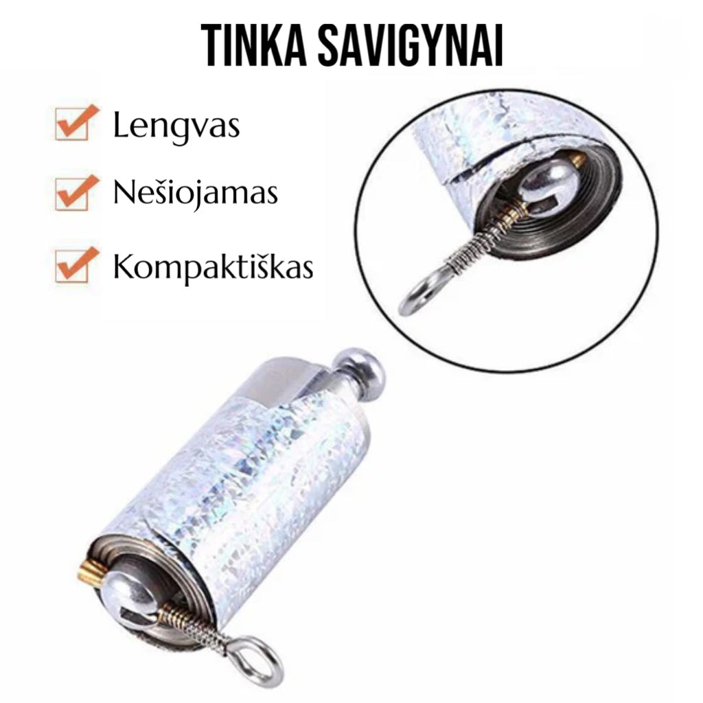 Nešiokite lazdą. kad užtikrintumėte savo saugumą! Ji išplečiama nuo 2' (5 cm) iki 5' arba 120 cm per kelias sekundes. Su savo paslėpta forma galite tyliai išleisti šią lazdelę. kai esate pavojingose situacijose!