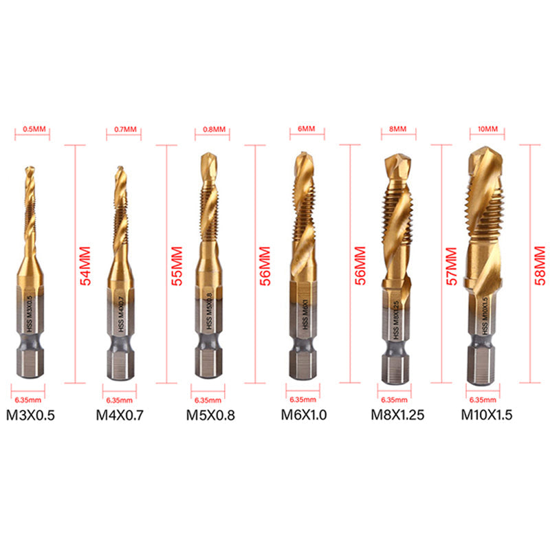 Rinkinyje yra šeši skirtingi dydžiai nuo M3x0,5 mm iki M10x1,5 mm. Tokia įvairovė patenkina daugybę gręžimo poreikių.