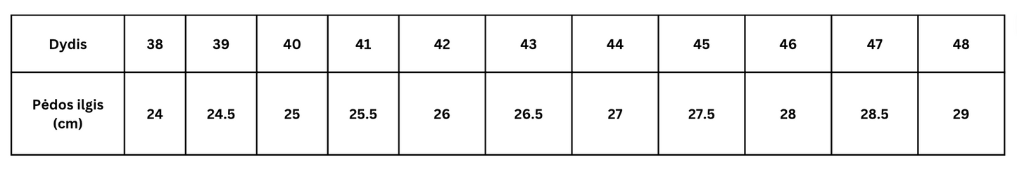 Dažnai sunku rasti batus didesnėms ar platesnėms pėdoms. Šie batai turi platų dydžių spektrą nuo 38 iki 48 dydžio.