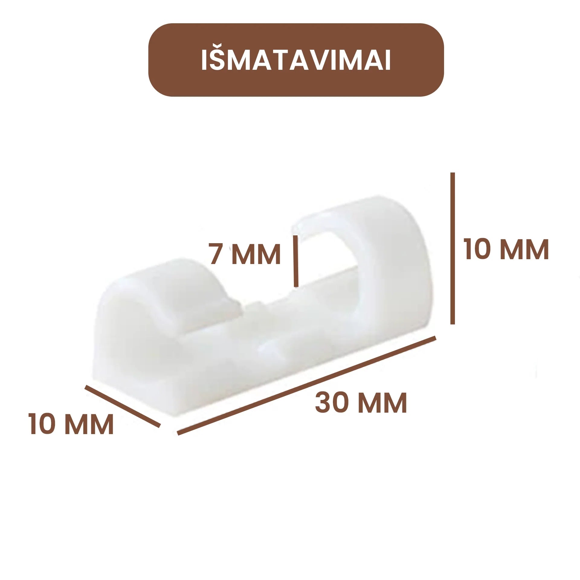 - Aukštos kokybės plastikas. Laidų laikikliai pagaminti iš itin patvaraus ir kokybiško plastiko, kuris užtikrina ilgaamžiškumą ir yra atsparus lūžiams.