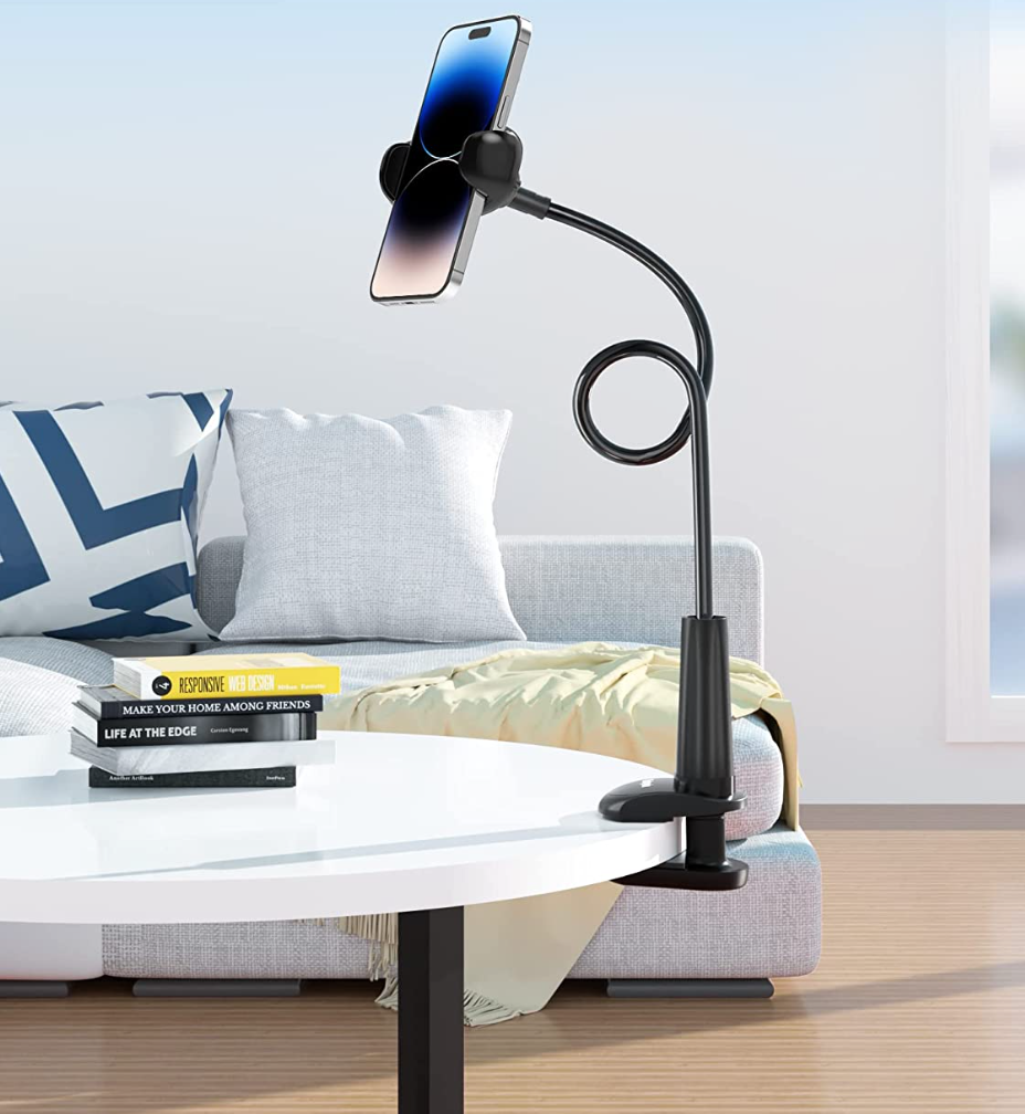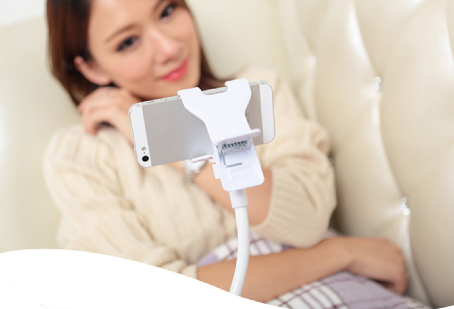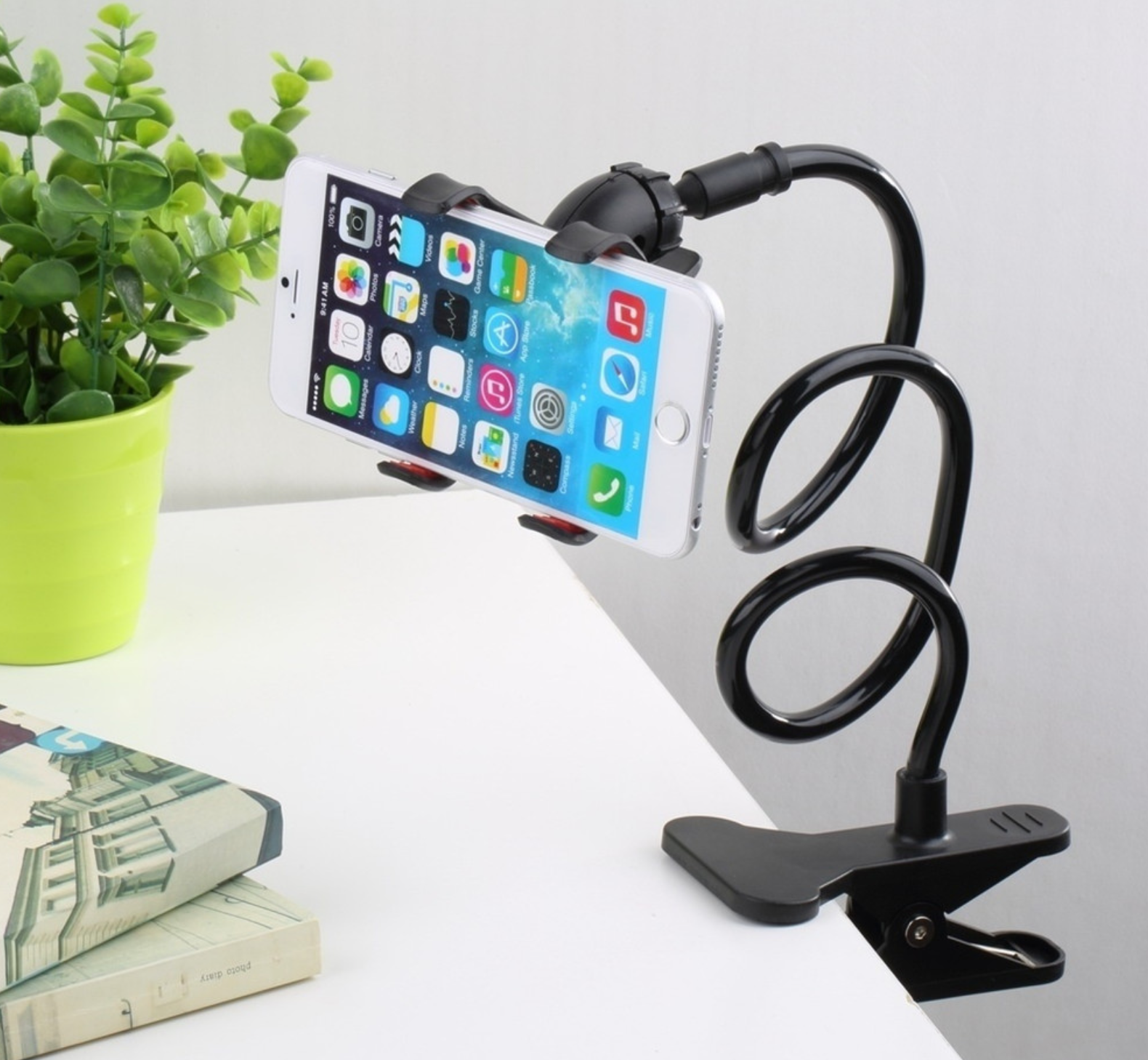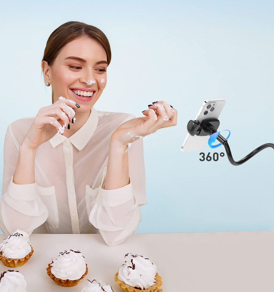 Dėl galimybės laikiklį pasukti 360° kampu ir lanksčios rankenos, galite pasistatyti telefoną Jums patogiu kampu, kad jo nereikėtų laikyti.