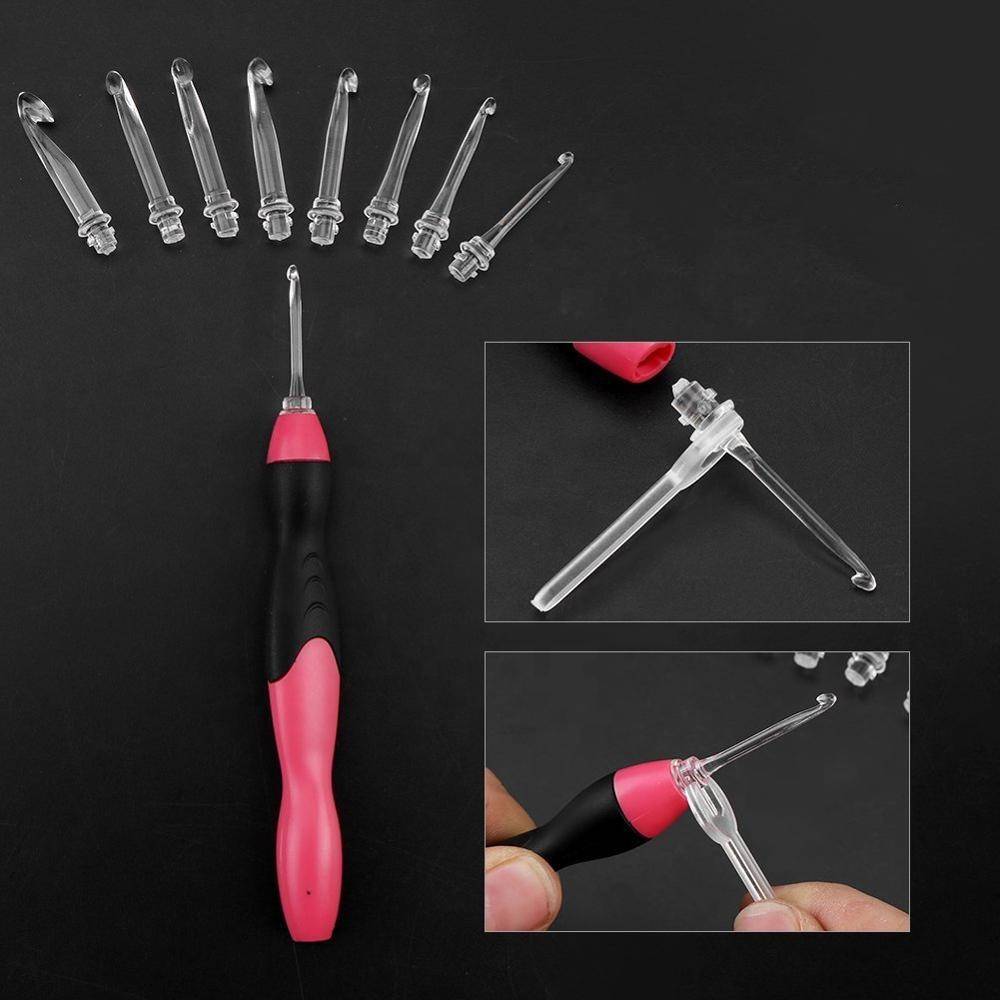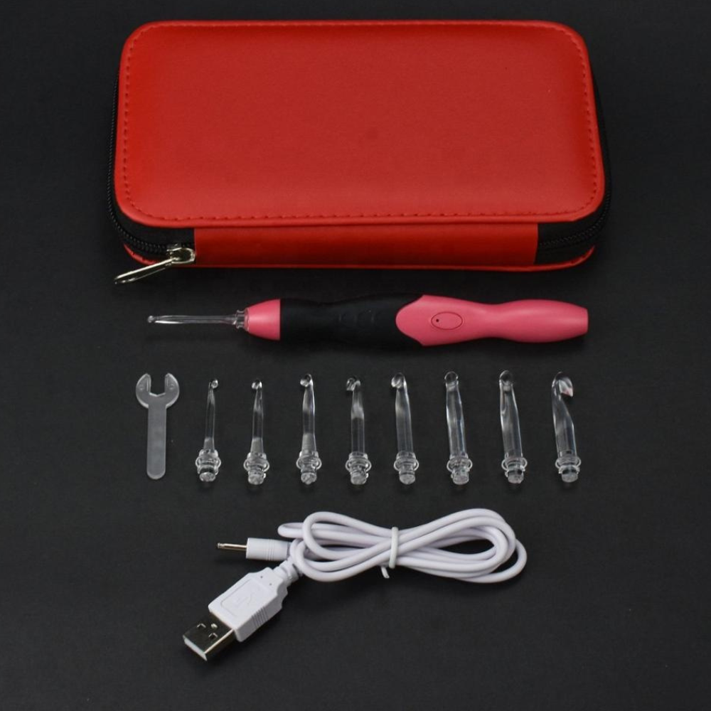 LED vąšelis turi keičiamas galvutes nuo 2,5 mm iki 6,5 mm, kurios sudėtos patogiame dėkle, todėl galite naudoti vąšelį skirtingiems nėriniams.