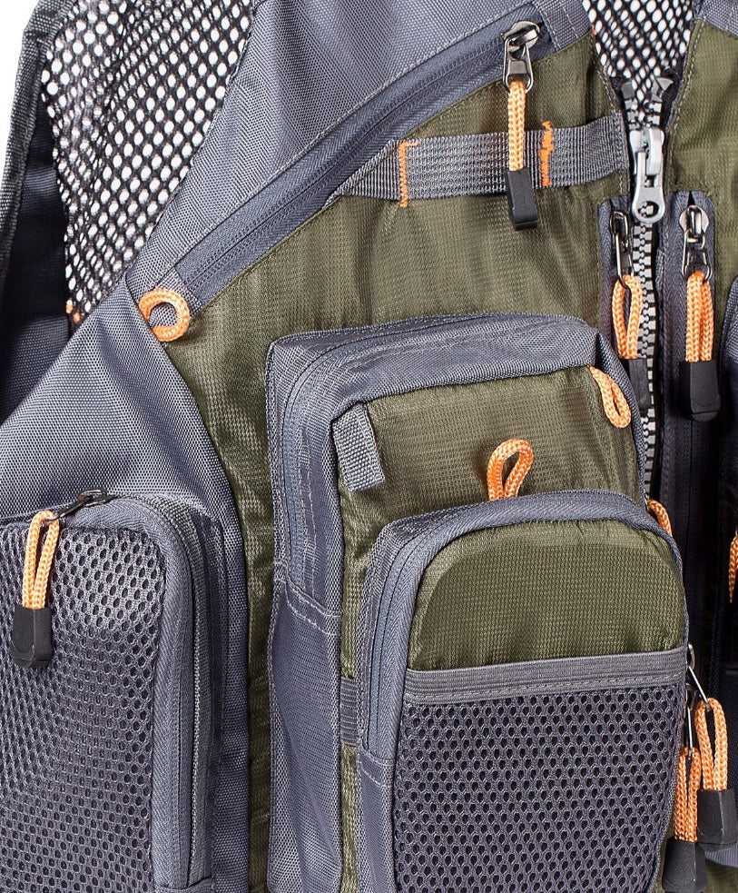 Ši žvejybos liemenė turi 18 kišenių (įskaitant 14 užtrauktukais užtraukiamų kišenių), kuriose galima saugiai laikyti viską, nuo musių dėžučių iki termometrų.