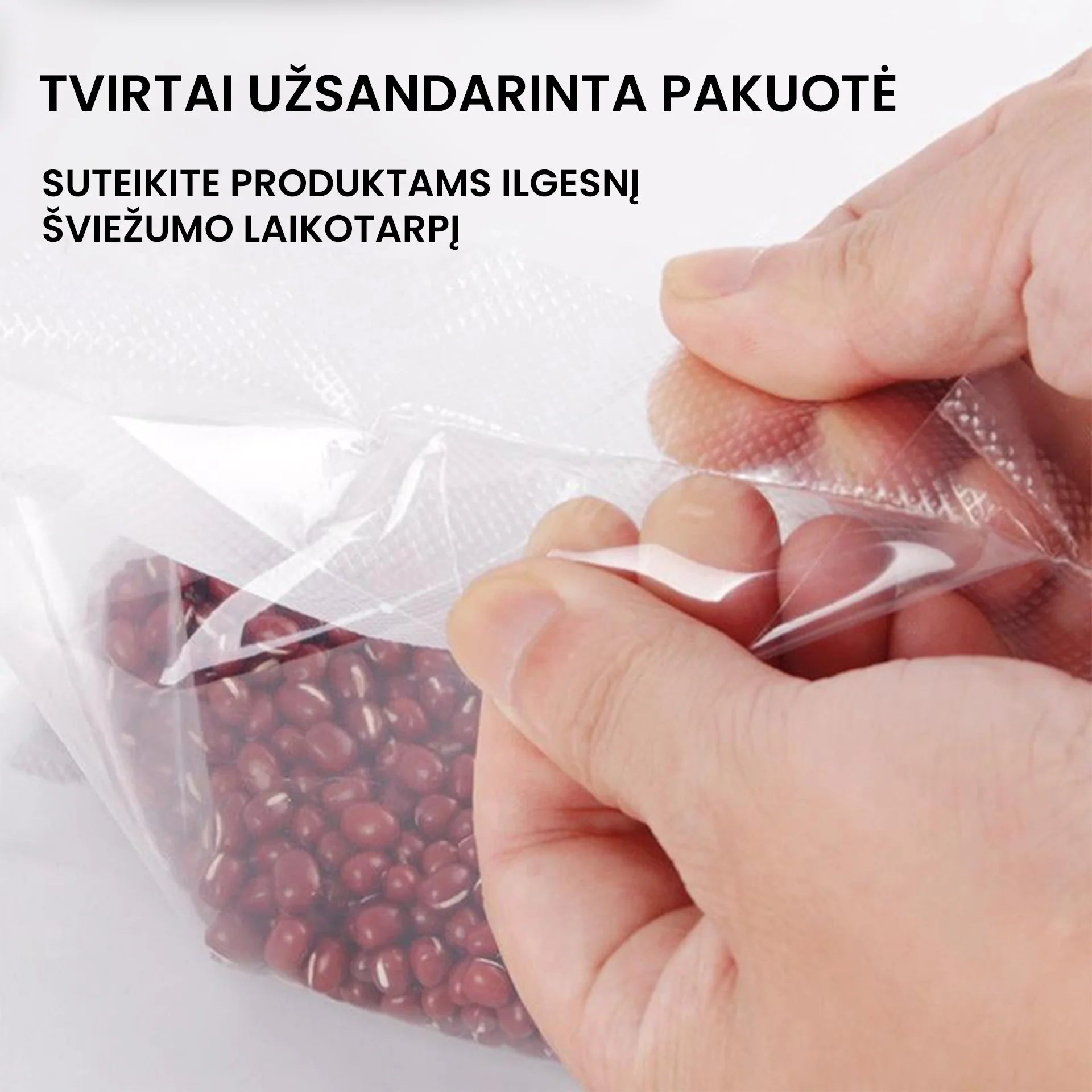 - Lengva ir paprasta naudoti. Norėdami užsandarinti esančius produktus maišelyje, leiskite aparatui įkaisti apie 10 sekundžių. Įkaitus aparatui paimkite atidarytą maišelį, įspauskite maišelio galą tarp karštų sandarinimo plokščių ir tvirtai perbraukite tiesia linija. Braukite vieną kartą, kad maišelis būtų garantuotai hermetiškai uždarytas vienu perbraukimu;
