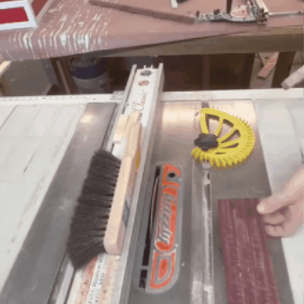 - Laikykite medieną prieš pjūklą, naudodami stumdomąjį bloką kaip vadovą.