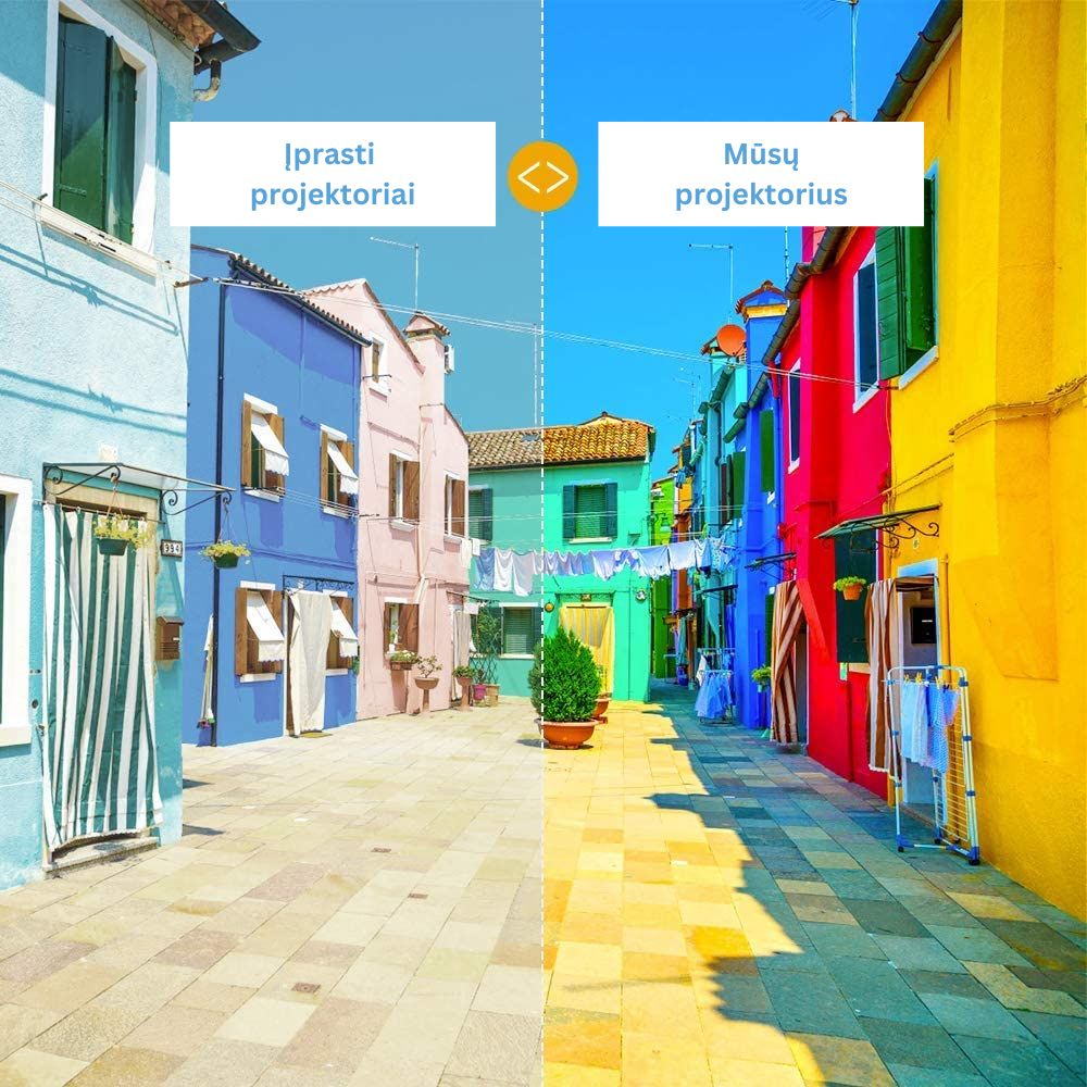 Tikrai taip, jis daug saugesnis vaikams nei bet kuris ekranas, nes spinduliai nukreipiami į sieną, o ne tiesiai į akis.