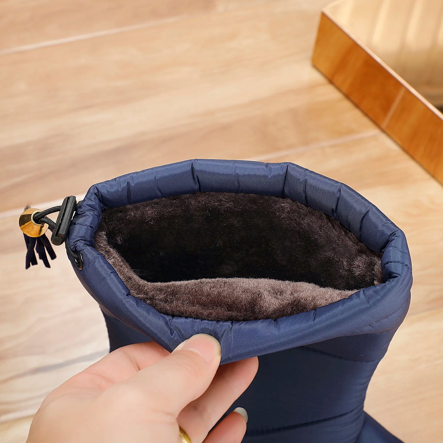 Minkštas dirbtinis kailis apima visą vidų, o sutraukiamas dirželis padeda apsisaugoti nuo vėjo ir sniego.