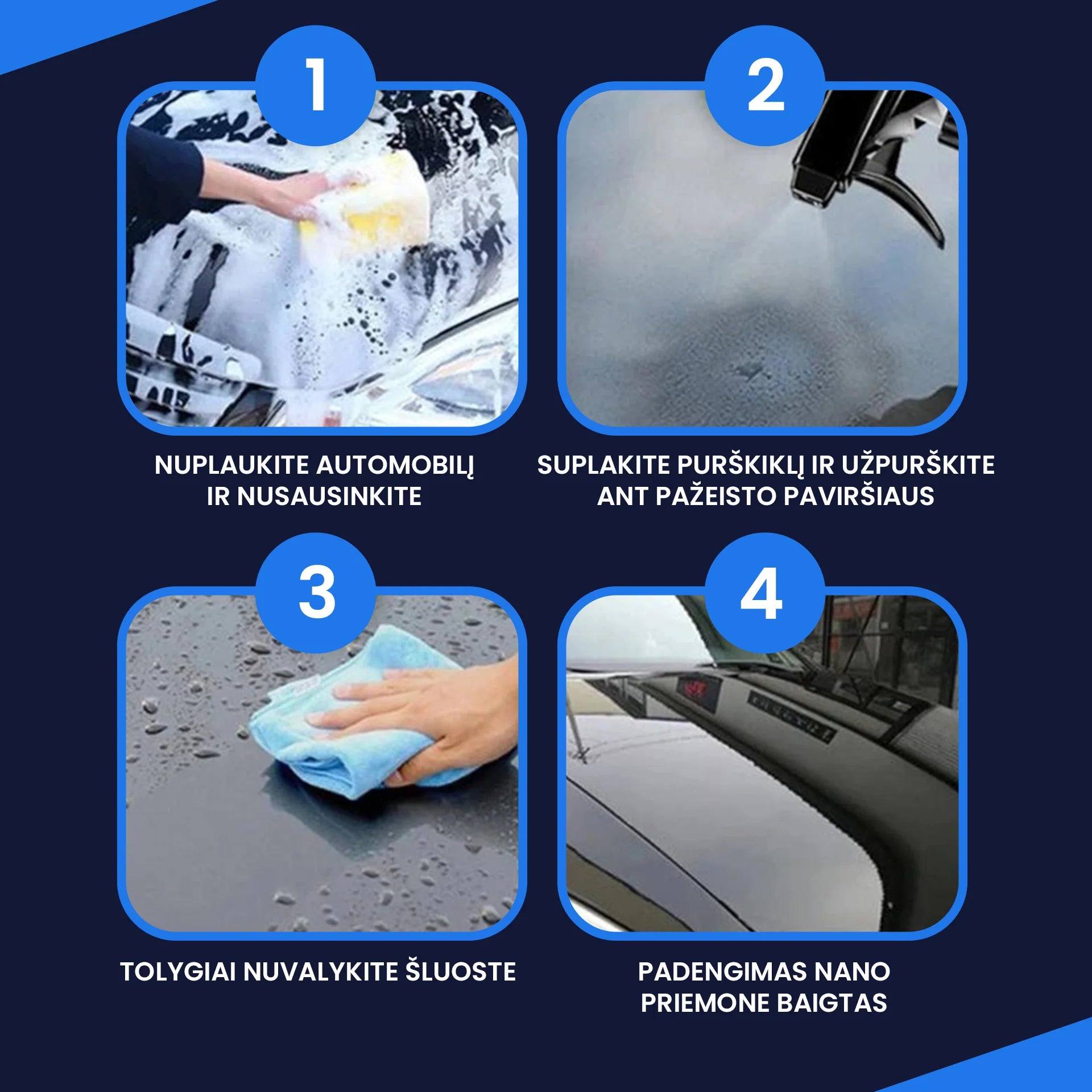 - Sukurtas Nano technologijos produktas nepriekaištingai šalina esančius trūkumus bei užpildo akmenukų įdaužų paliktas duobeles. Purškiklis suformuoja apsauginį keramikinį bei hidrofobinį sluoksnį, kurių dėka automobilis tampa atsparesnis įbrėžimams ir kitiems pažeidimams. Yra lengviau prižiūrimas bei valomas.