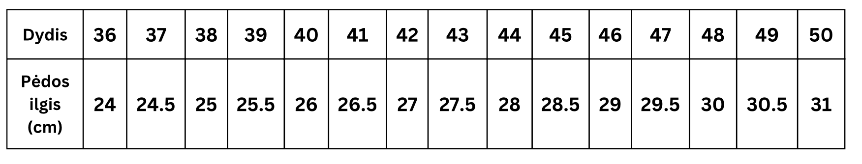 1) Kokie yra galimi batų dydžiai?