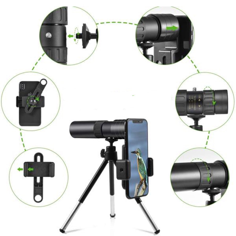 Reguliuojamo dydžio išmaniojo telefono laikiklis ir trikojo jungtis leidžia stabiliai fiksuoti tai, ką stebite. Prijungus teleskopą prie telefono, galite išsisaugoti gražiausių vaizdų nuotraukas.
