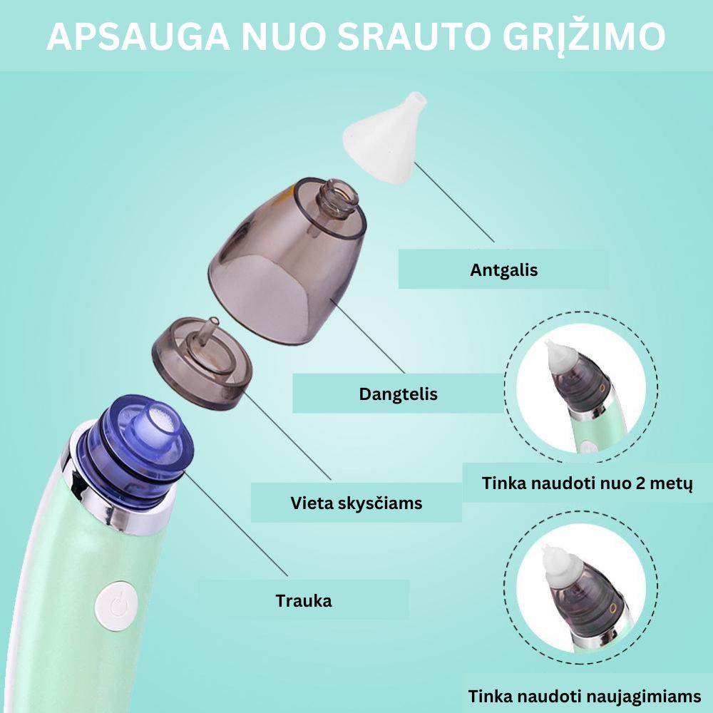 Su šiuo automatiniu nosies aspiratoriumu pašalinsite skysčius iš mažylio nosytės vos per kelias sekundes! Traukos stiprumas - 40PKA.