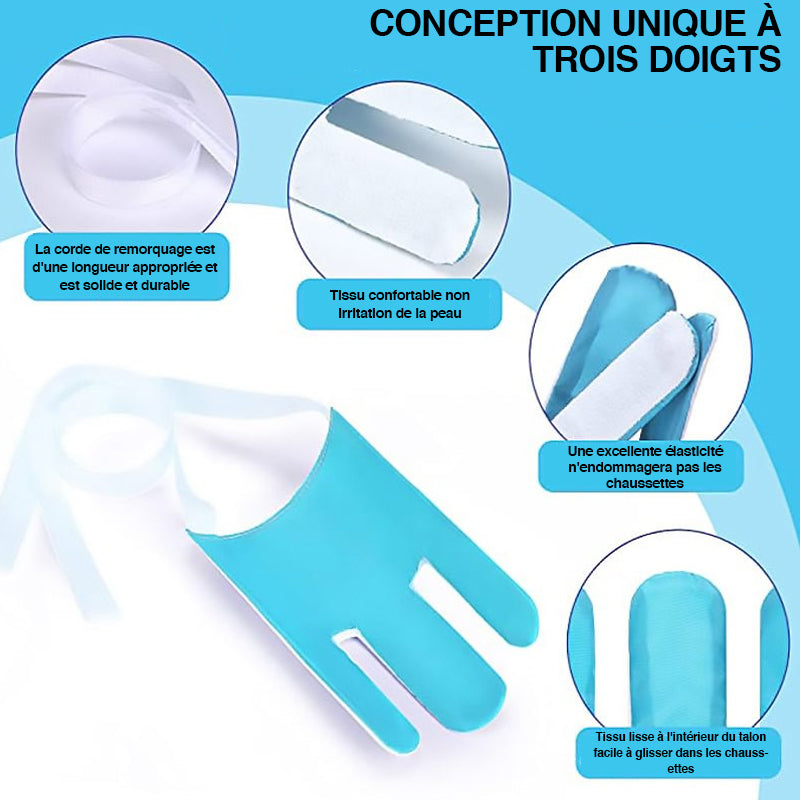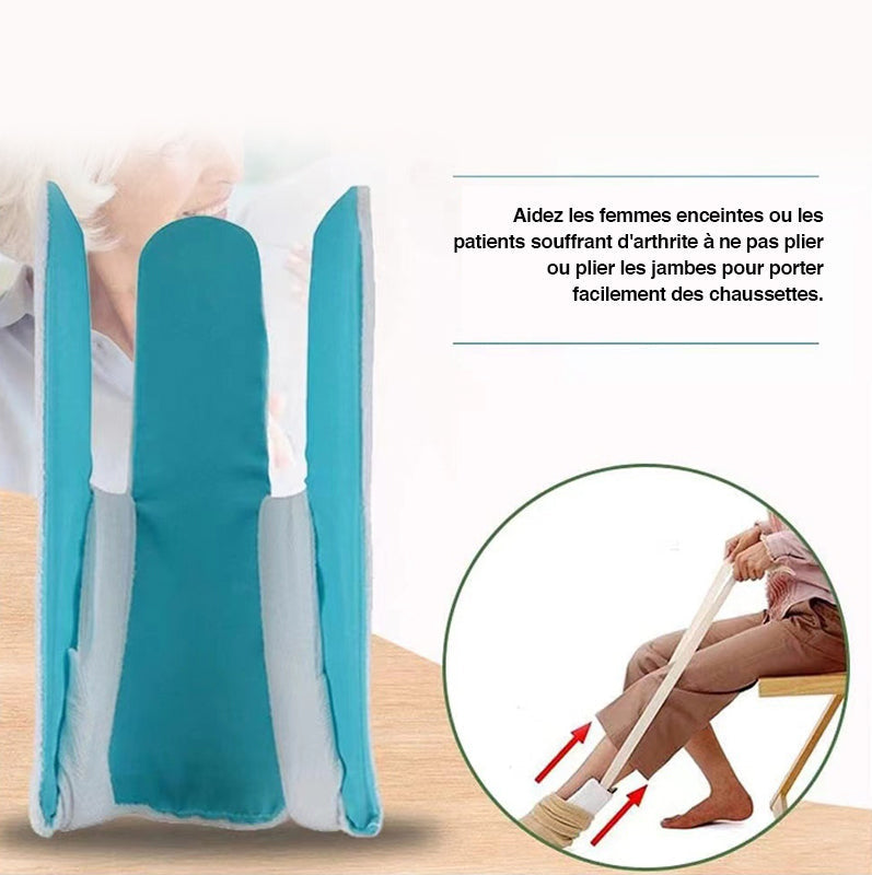 - Paprastas ir lengvas kojinių movos naudojimas! Užmaukite ant movos kojinę ir pastatykite koją prieš movos rėmą. Rankenų pagalba patraukite į movą į viršų, kad kojinė pilnai užsimautų ant kojos.