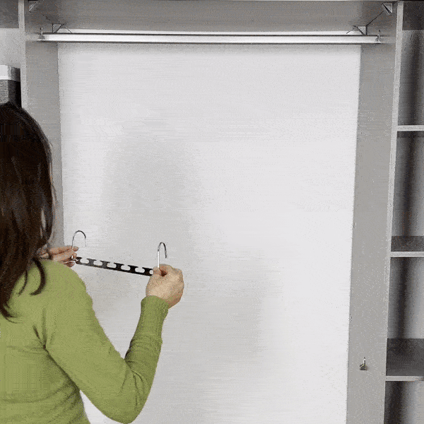 Ant šio laikiklio galite sukabinti, net šešias pakabas su drabužiais! Tai labai patogus laikiklis, kurį galima laikyti ant vieno kabliuko arba ant dviejų. Nereikia jokių papildomų varžtų, montavimo priemonių! Laikiklio kabliukai tvirtai laikosi spintoje ant esančio turėklo.