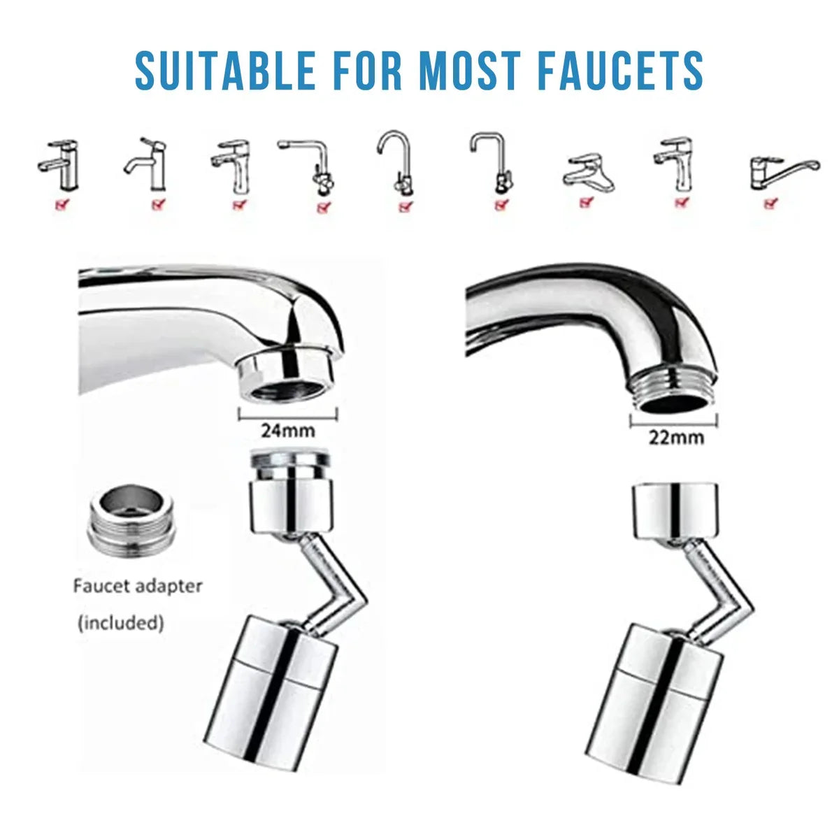 - Universali galvutė tinka visiems standartiniams maišytuvo čiaupams su išoriniu M22 ir vidiniu M24 sriegiu. Pagamintas iš aukštos kokybės vario, yra su chromuota apdaila. Galvutė atspari korozijai ir rūdims, pasižymi ilgaamžiškumu. Galvutę galima pritvirtinti prie virtuvės, vonios, dušo maišytuvų čiaupų.