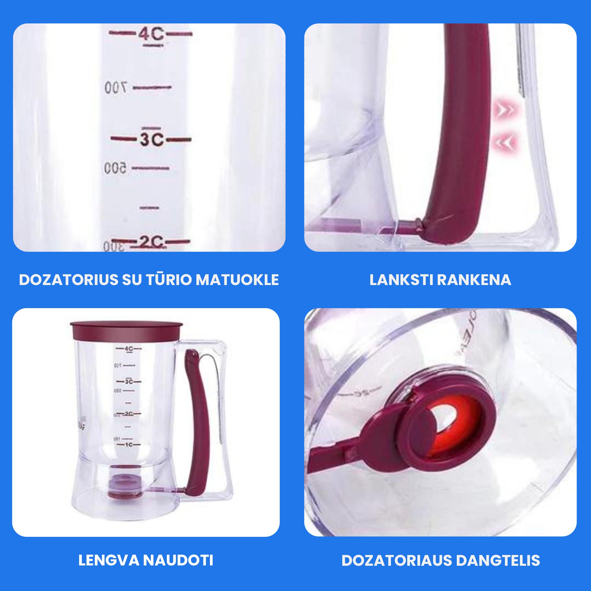 - Rankinis tešlos piltuvas, kuris tiksliai matuoja tešlos kiekį, leidžia pasiekti tinkamą konsistenciją bei garantuoja puikų kepimo rezultatą.