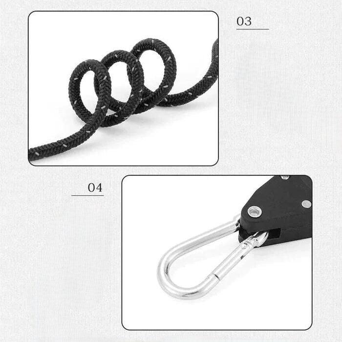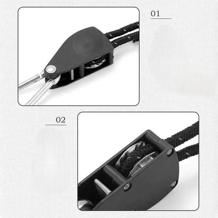 -  1 × Nešiojama reguliuojama stovyklavimo virvė su skriemuliu