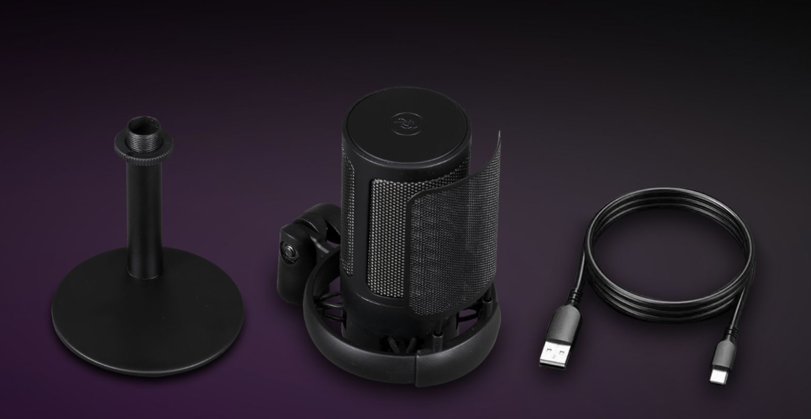 Komplektacijos sudėtis: 1 mikrofonas, 1 USB-C laidas ir stovas.