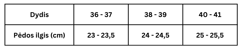Rekomenduojame naudotis pateikta dydžių lentele. Išmatuokite savo pėdos ilgį ir palyginkite jį su pateiktomis dydžių parinktimis.