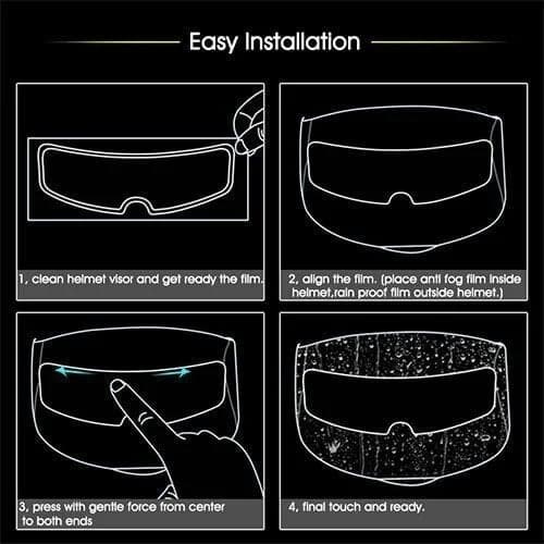 - Speciali plėvelė nuo rasojimo yra užklijuojama ant šalmo stikliuko. Tai efektyvi apsauga nuo lietus, sniego, dulkių. Plėvelė yra visiškai atspari vandeniui, todėl stipriai lijant kelio matomumas išliks ryškus ir geras.