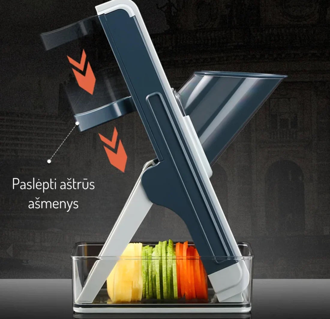 Mūsų daugiafunkcinė pjaustyklė teikia pirmenybę naudotojo saugumui. nes turi paslėptus ašmenis. užtikrinančius tikslų ir saugų įvairių maisto produktų. pvz.. vaisių. daržovių ir sūrių. pjaustymą.